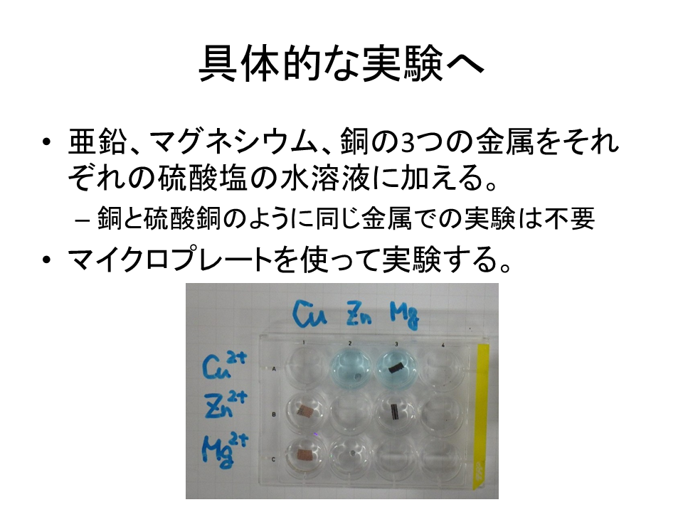 3年次研修の研究授業。3年生「化学変化と電池」今回の指導要領で登場した金属イオンのところ。亜鉛、マグネシウム、銅の金属になりやすさの実験を前時に終えて、その考察をするところです。ということで、用意してきたスライドを見てみましょう。1枚目のタ...