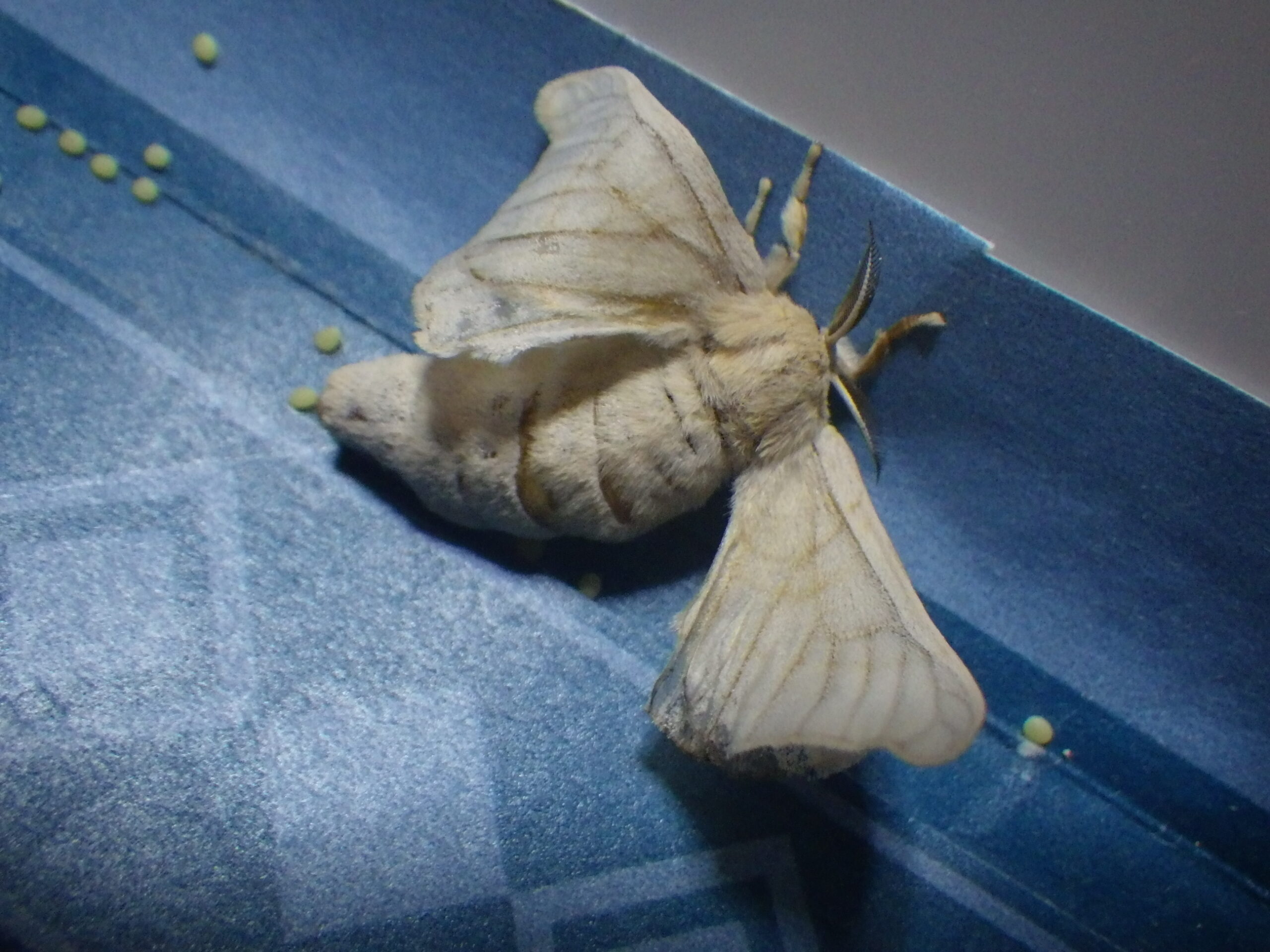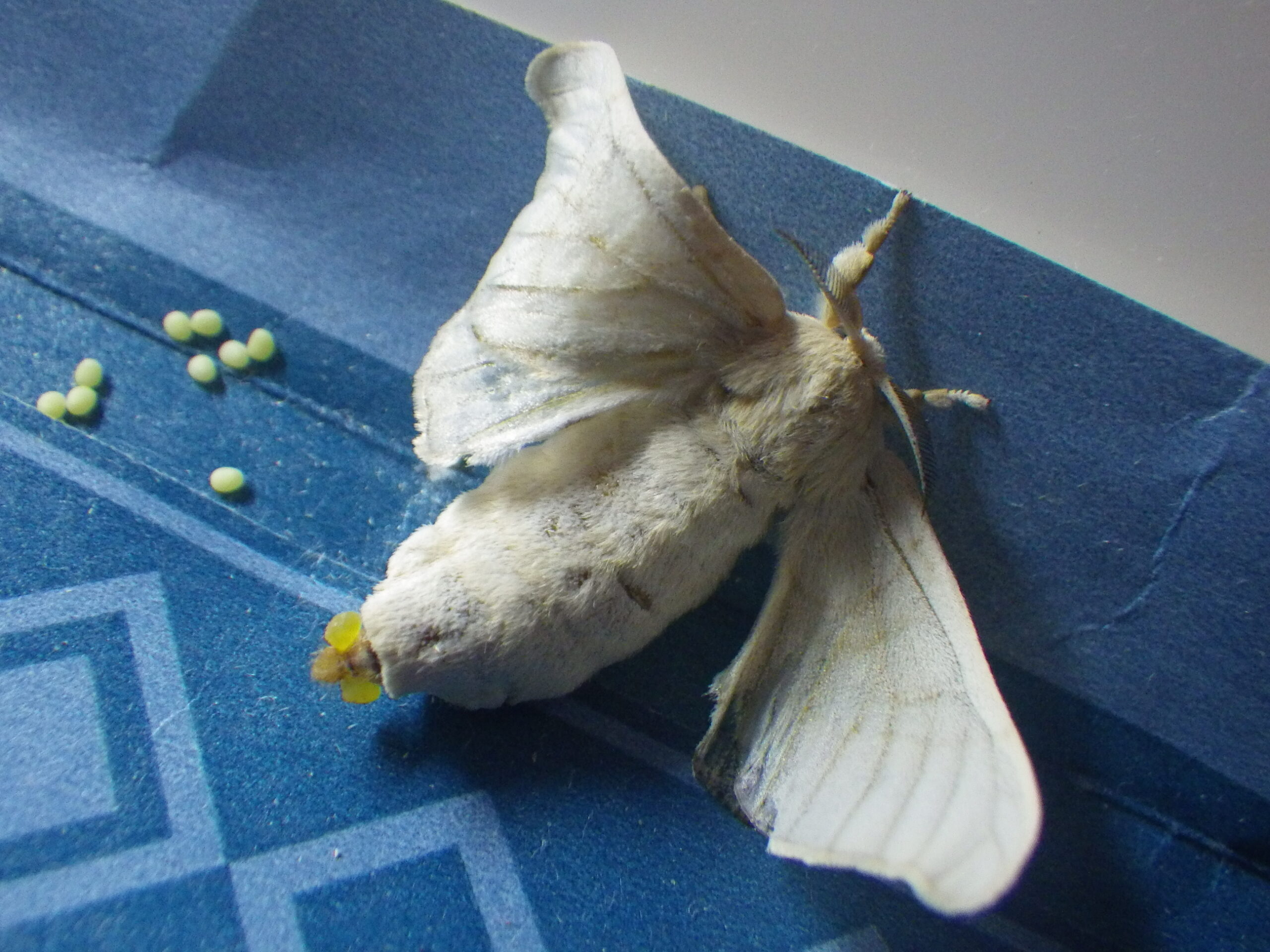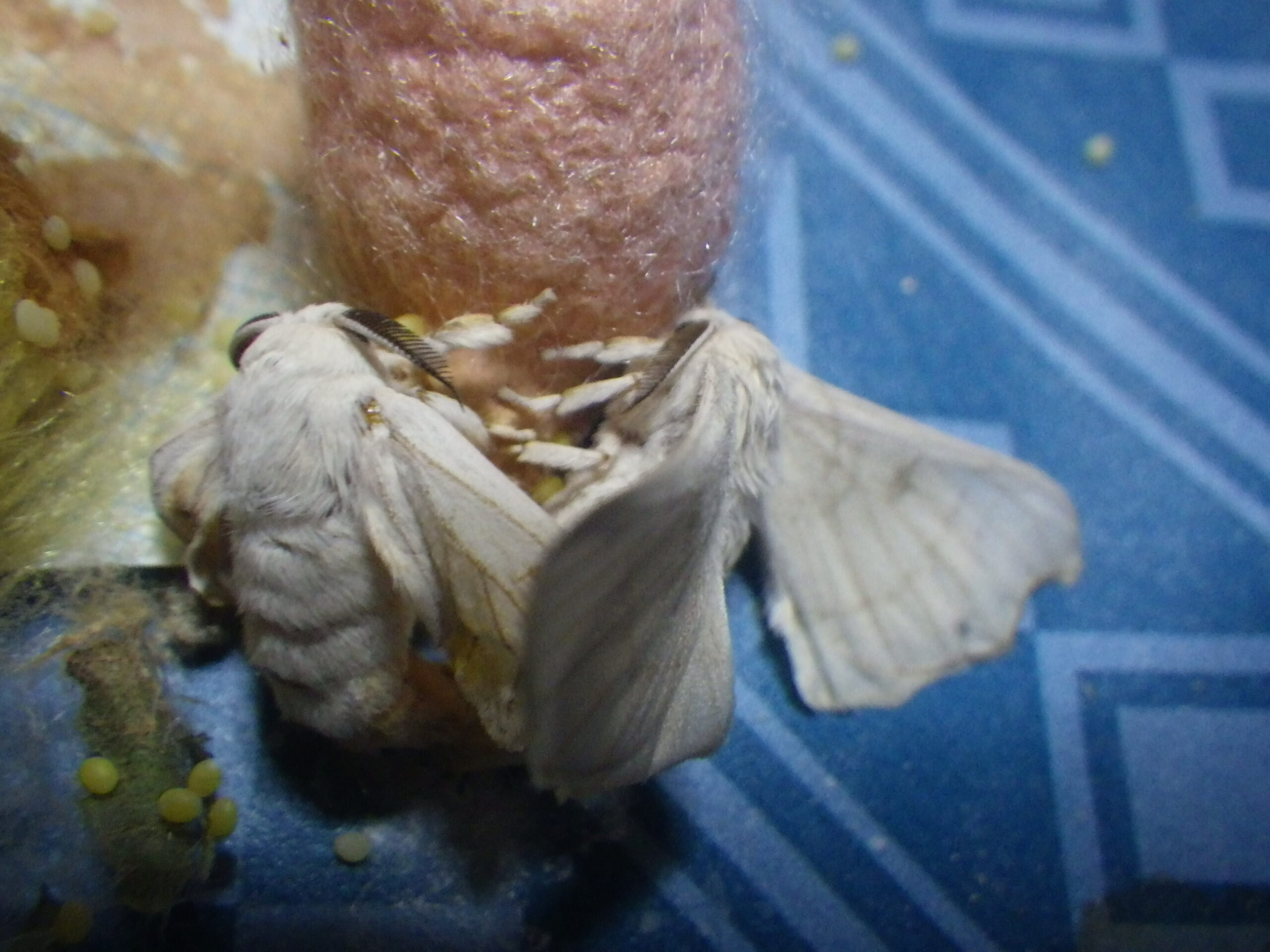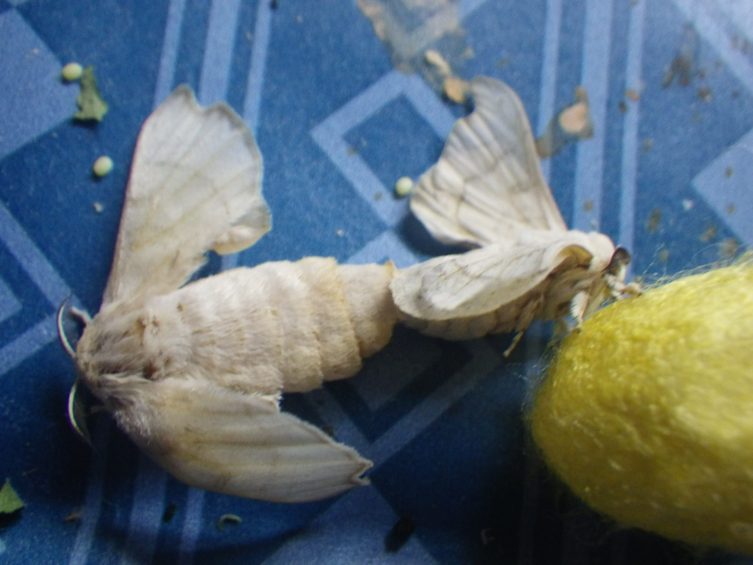 みんな同じ白いお蚕さんの成虫で、どれがどの繭から出てきたかもわからなくなるし、違う種類のカイコが交尾しているかもしれません。う~む。