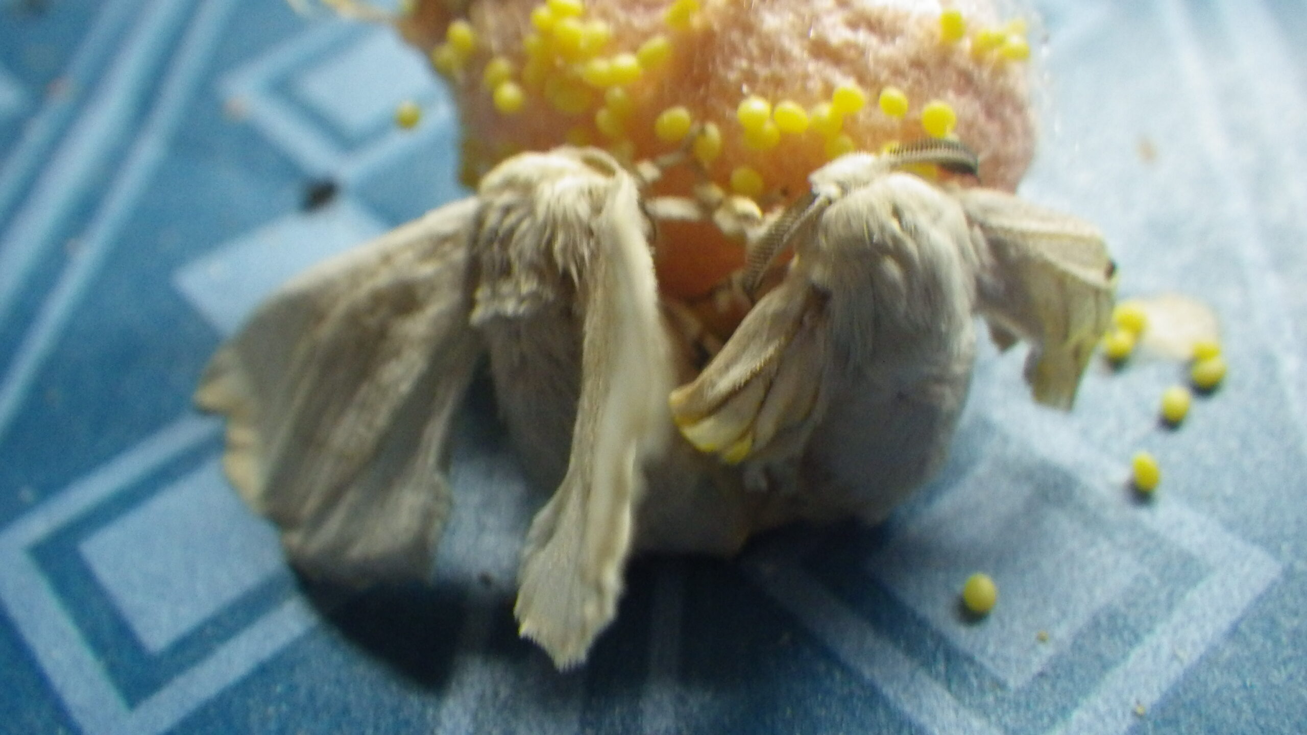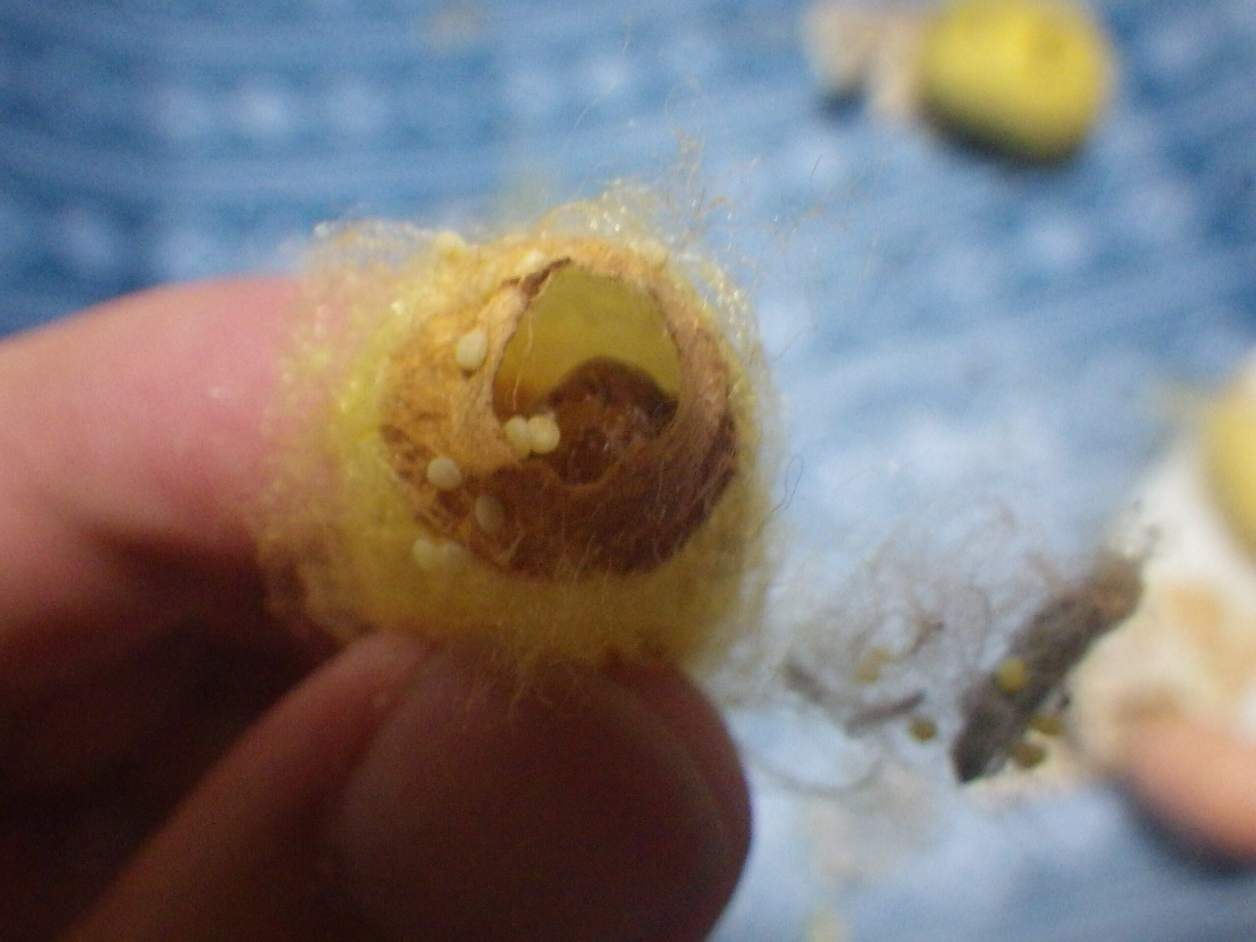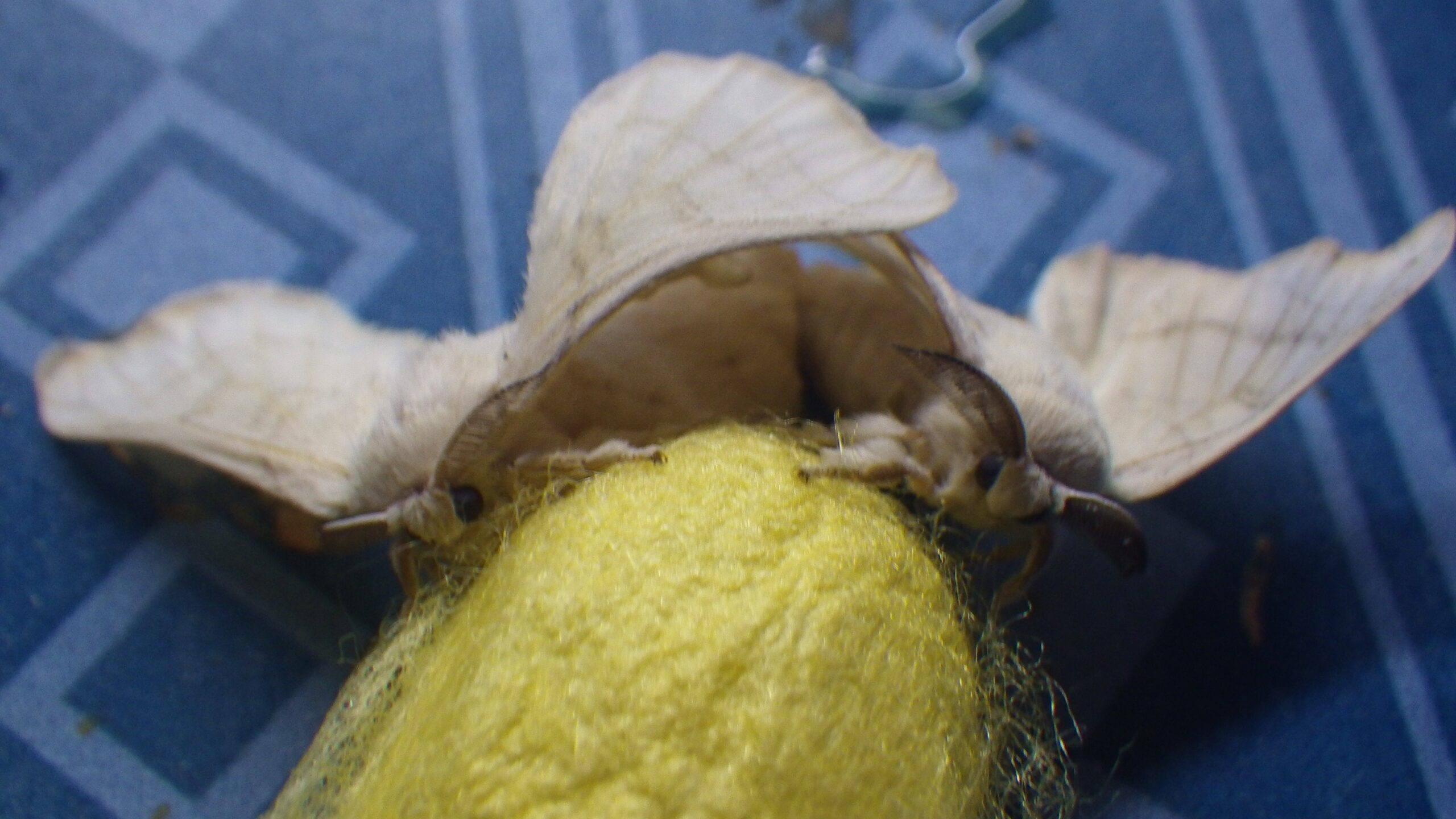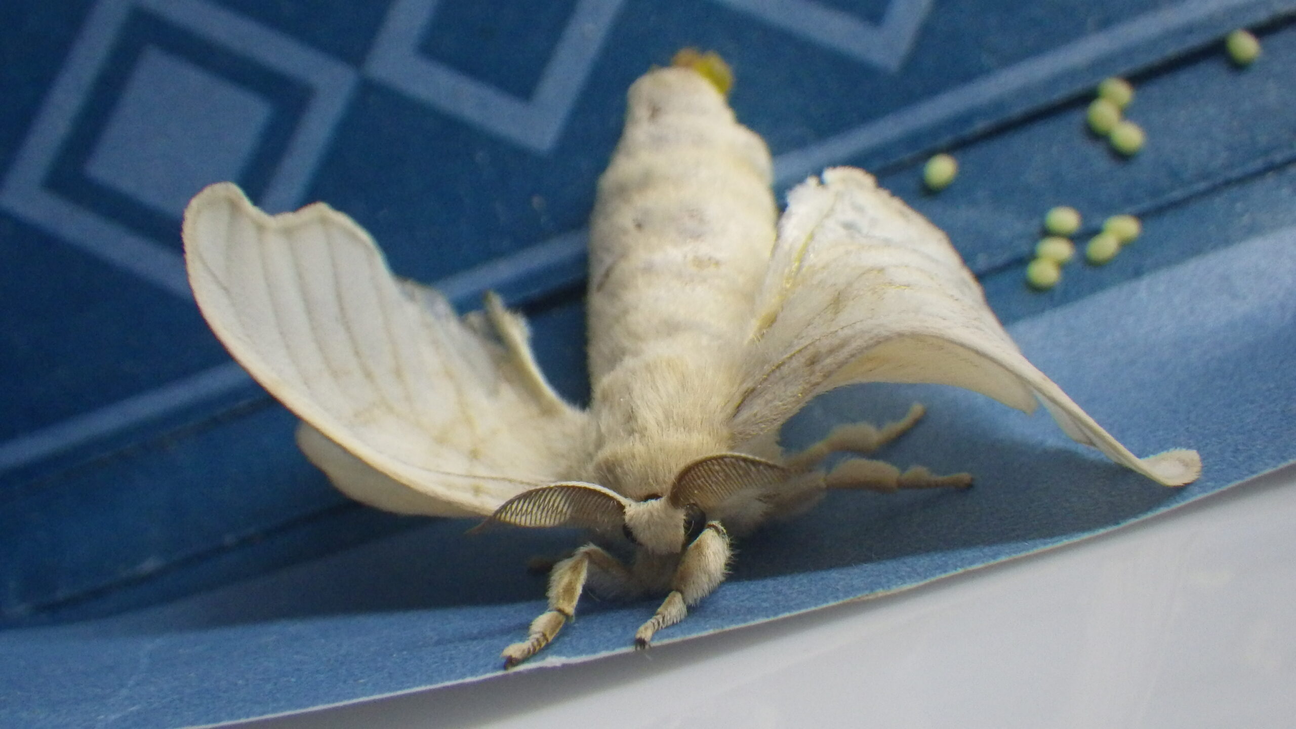 みんな同じ白いお蚕さんの成虫で、どれがどの繭から出てきたかもわからなくなるし、違う種類のカイコが交尾しているかもしれません。う~む。