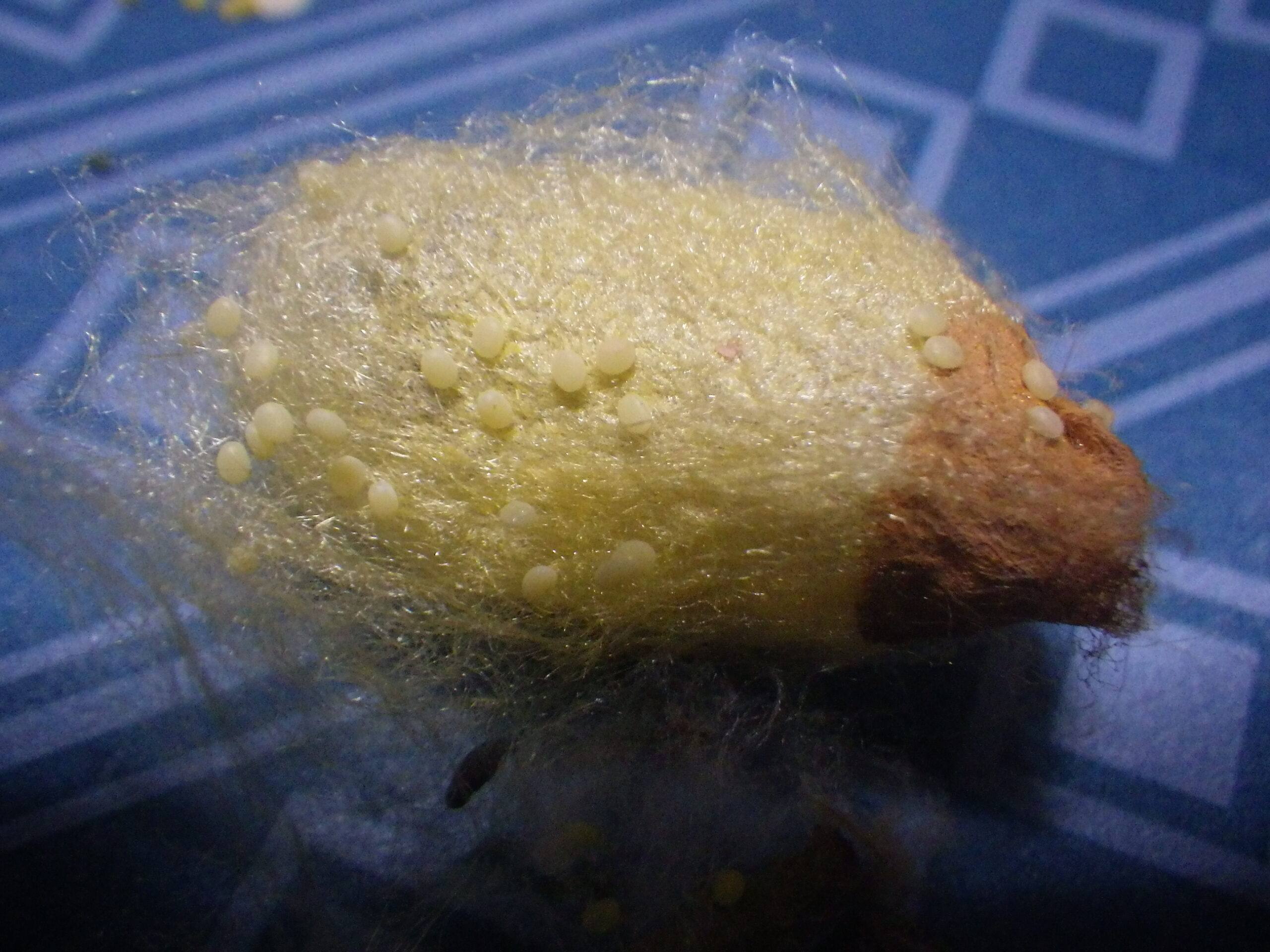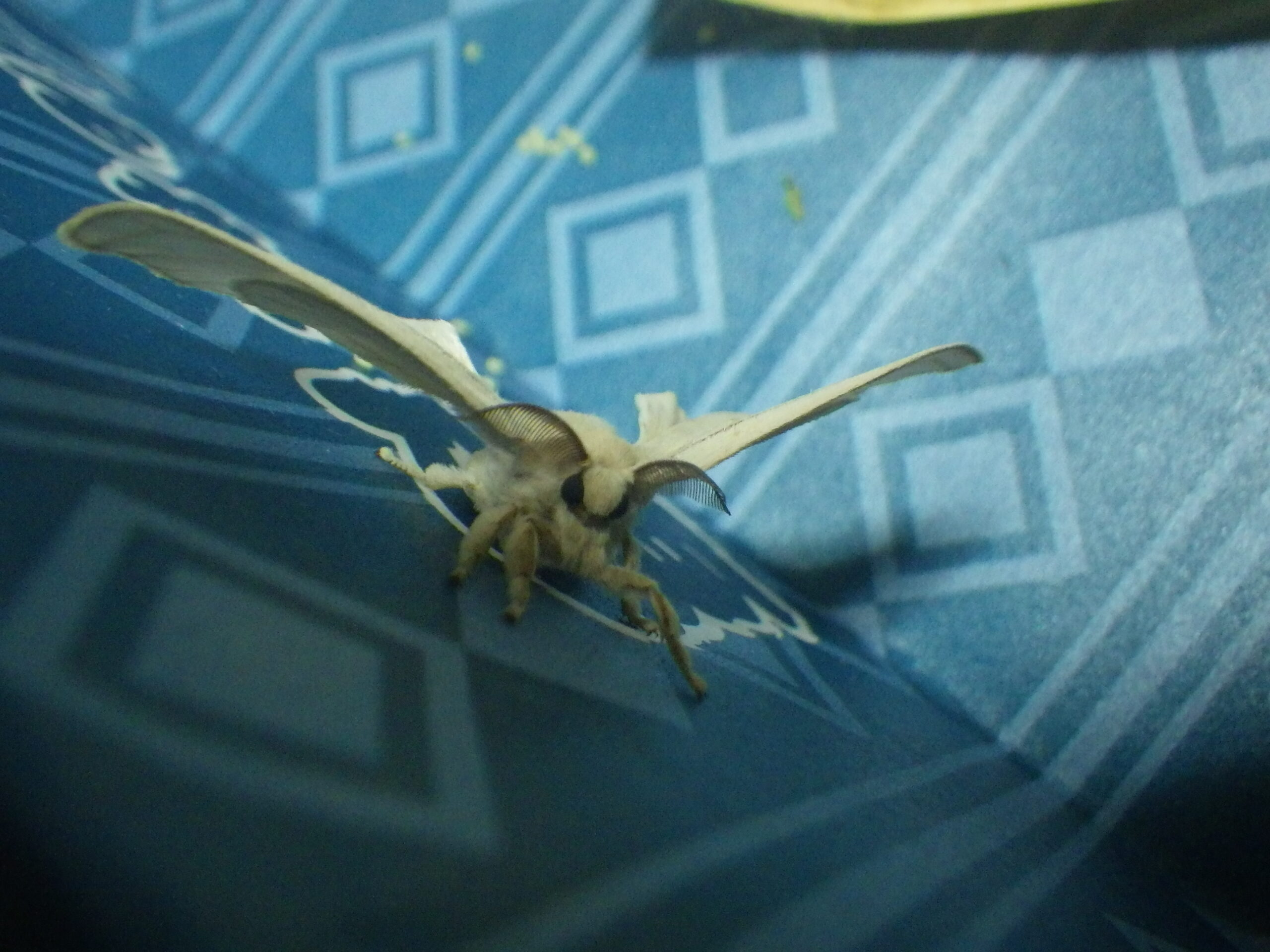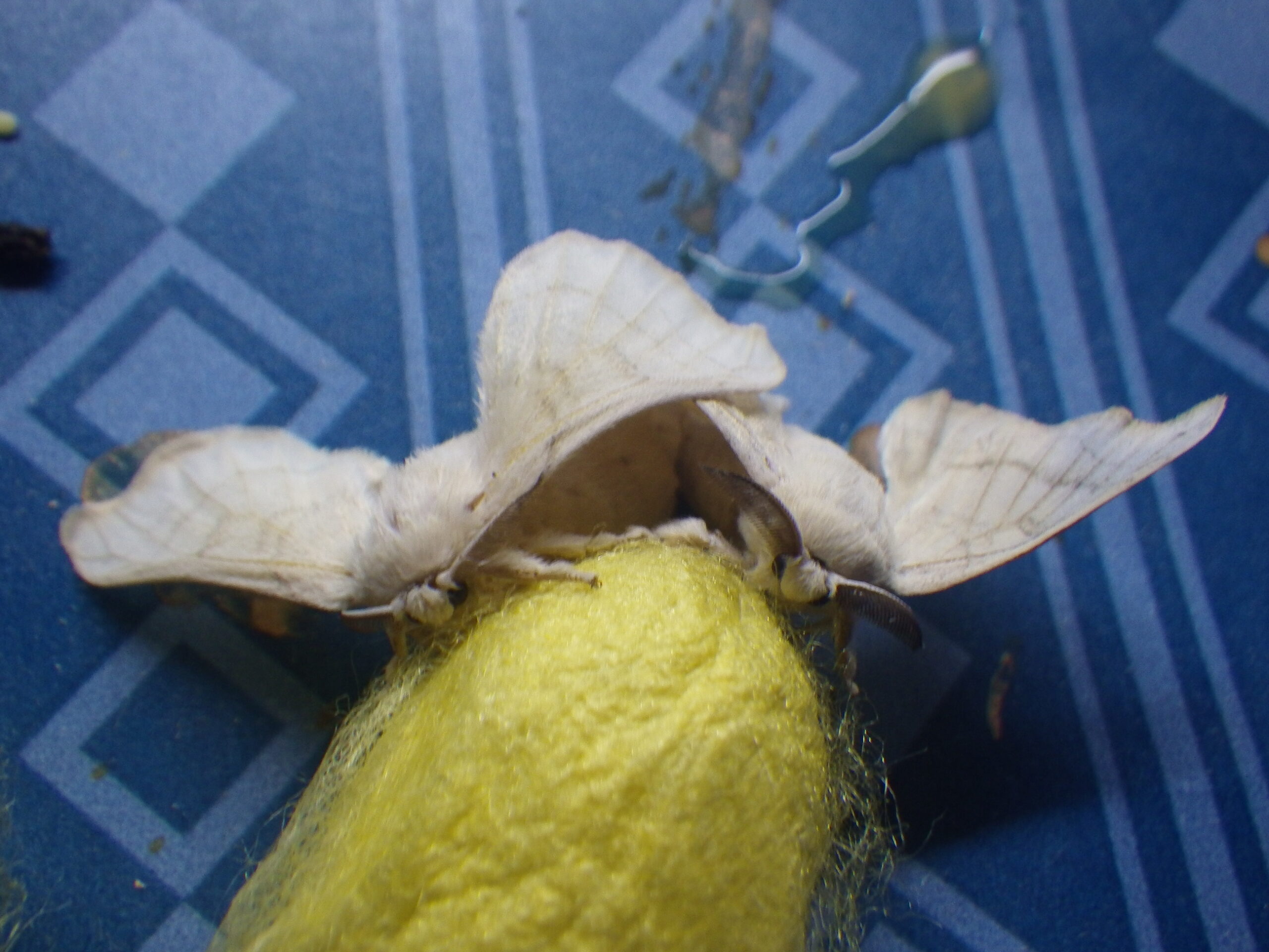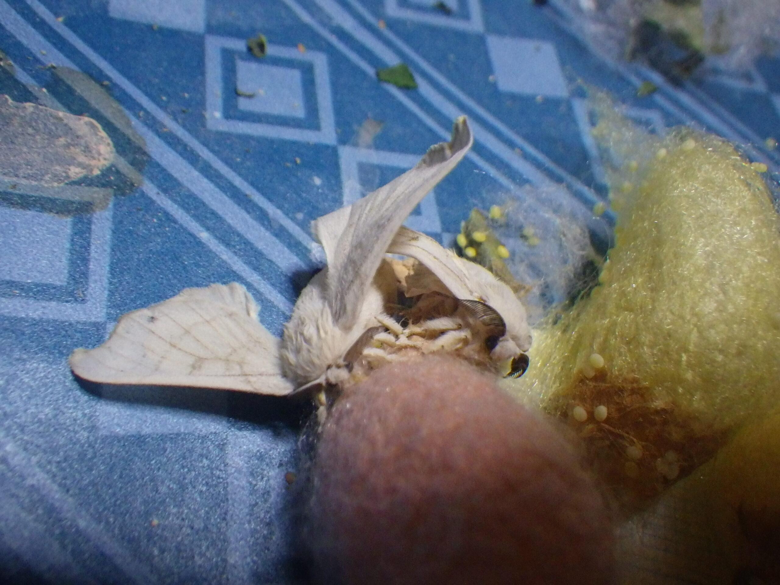 みんな同じ白いお蚕さんの成虫で、どれがどの繭から出てきたかもわからなくなるし、違う種類のカイコが交尾しているかもしれません。う~む。
