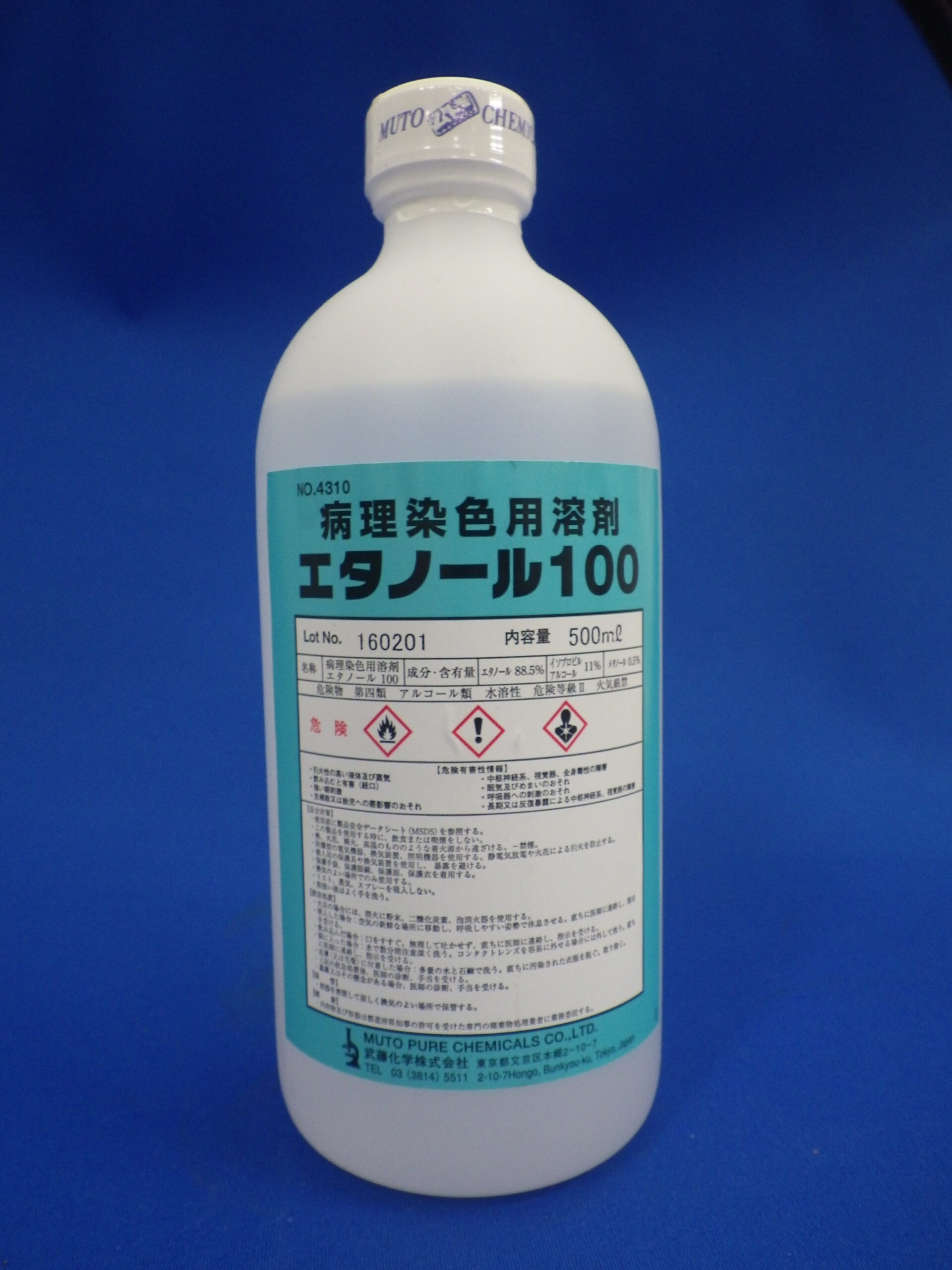 病理染色用溶剤エタノール100というのもあります。大学の先生が退官して研究室がなくなるのでいらなくなったのを「あ、エタノールだ、実験で使える!」と思っていただいてきたのですが、エタノールは88.5%、他にIPAが11%、メタノール0.5%という配分。病理・細胞診標本を作製するときに染色や脱水で使うのですが、消毒用エタノールIPと同様に、効果はほぼ変わらないけれど、飲めないので酒税の対象外になり、安く買えるというわけです。