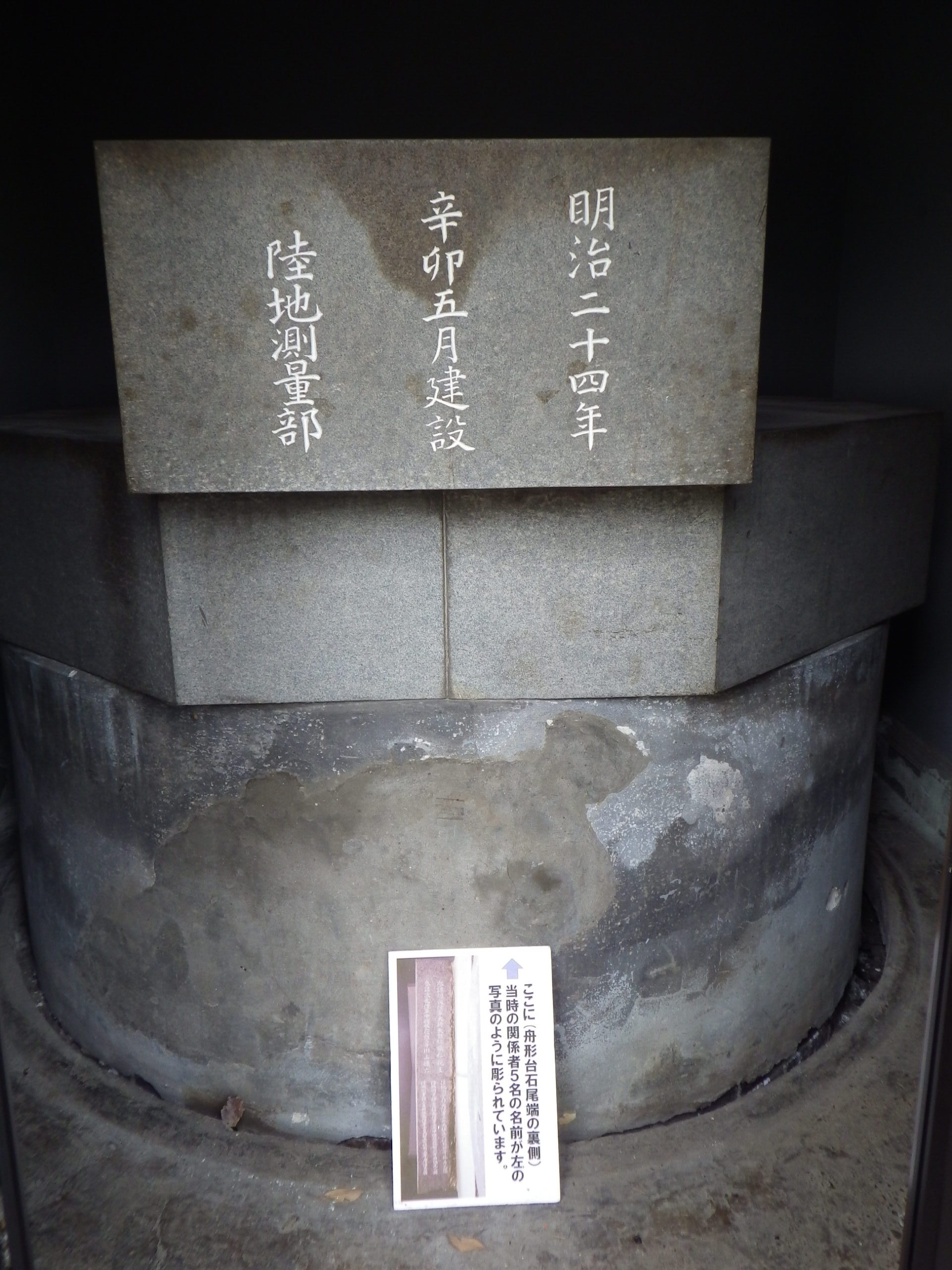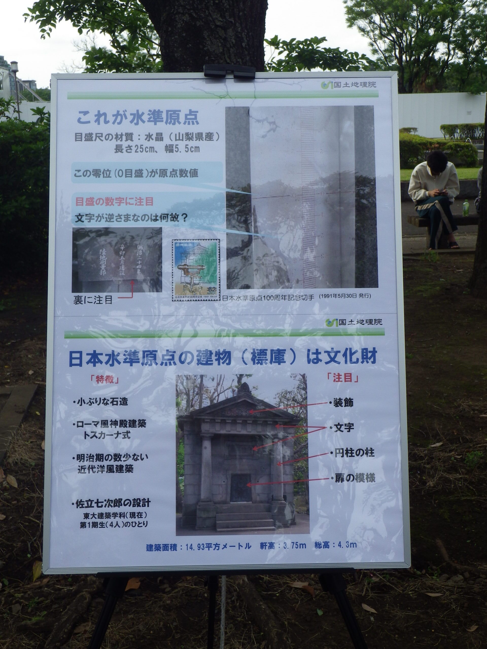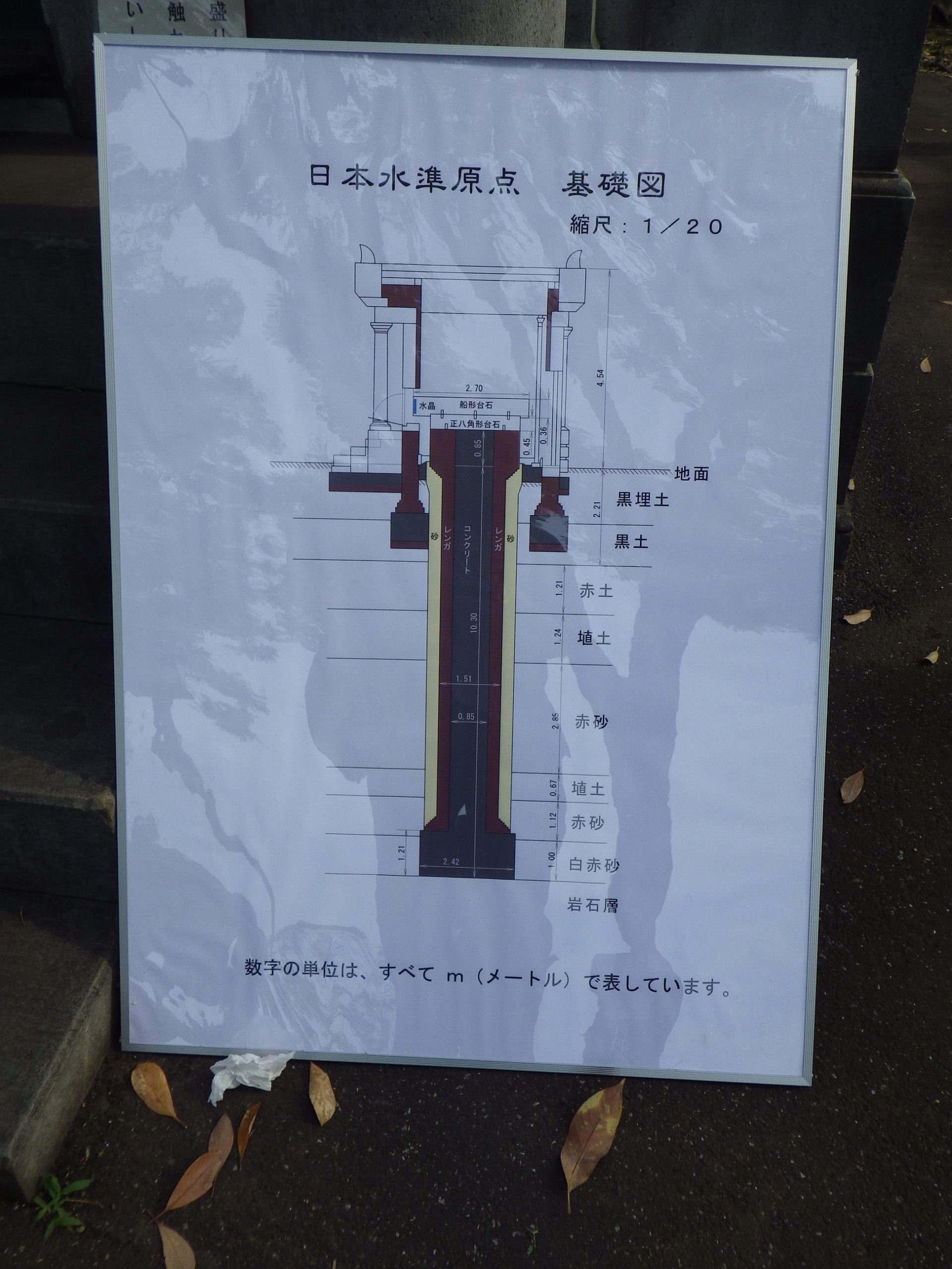 日本水準原点の零目盛りは、温度変化の影響を受けにくい水晶板に刻まれており、丈夫な花崗岩台石にはめ込まれ、固い岩盤まで達する約10mの基礎に支えられています。