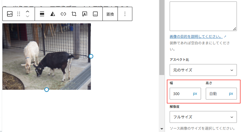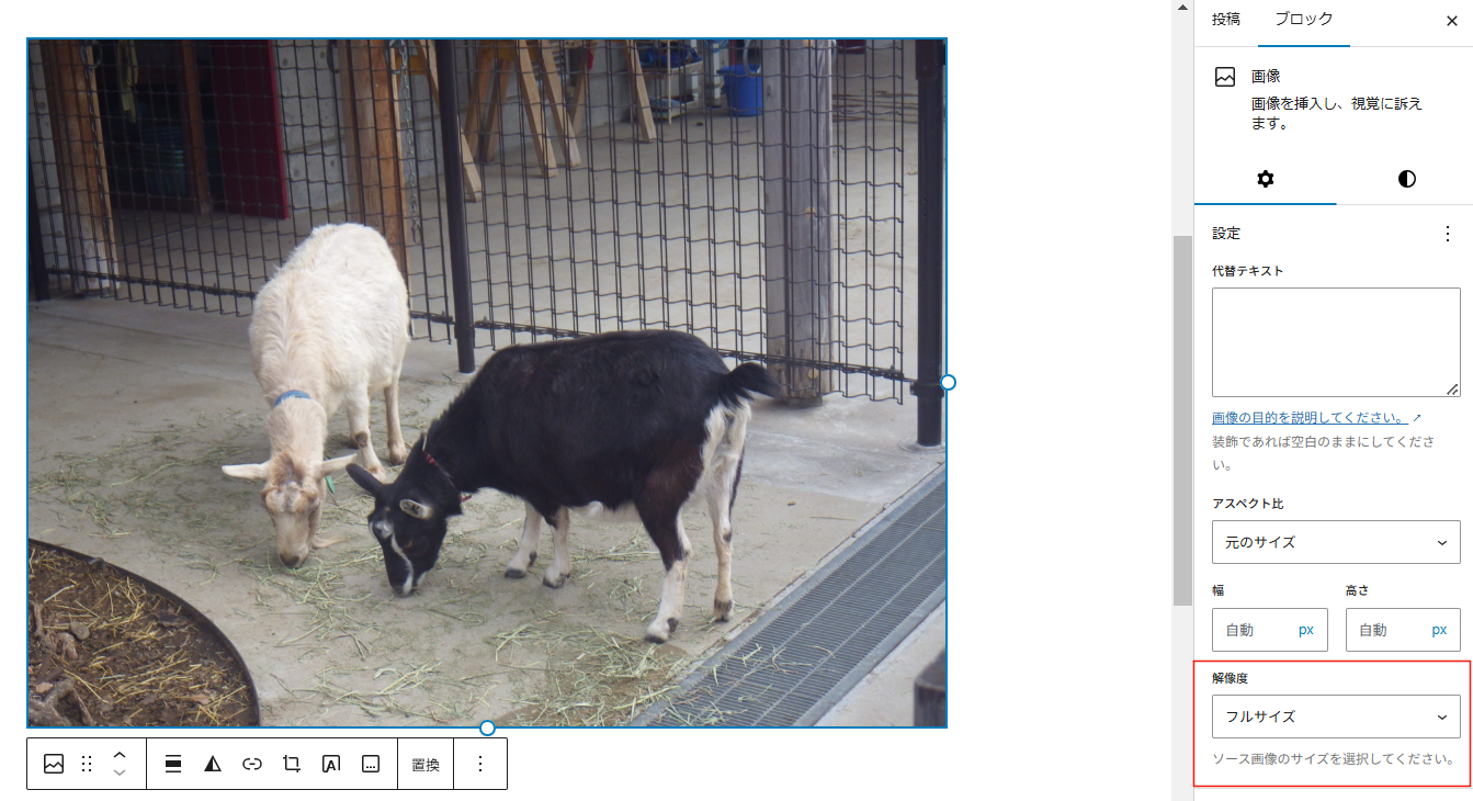なんかヒントはないかと、あちこちのページを見ていたのですが、WordPress | 画像サイズを「サムネイル」「中」「大」「フルサイズ」から選択または任意のサイズを指定するというページで、「動物とのふれあい」というページを作っている画像が載っていて、ヤギさん可愛いなと眺めていたら、「画像」ブロックという聞きなれない用語が。ブロックから画像選択?画像サイズ?そんなのないぞ?
