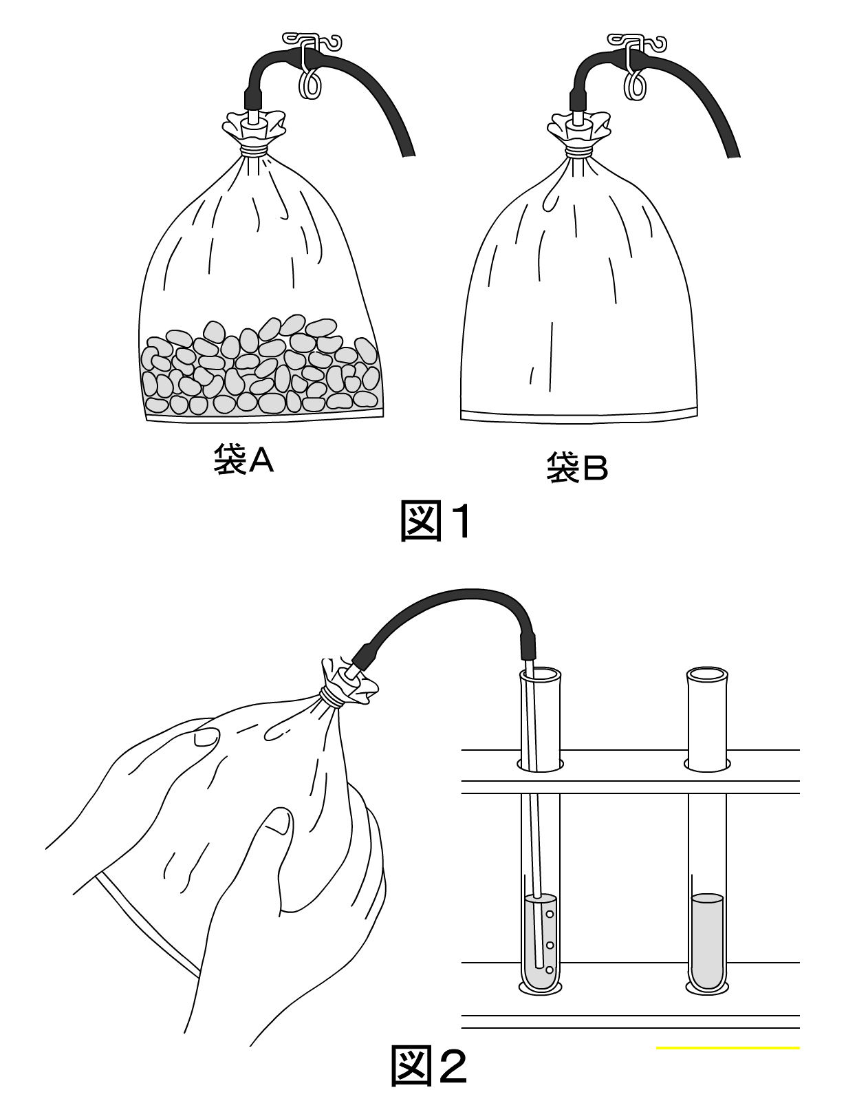 ①図1のように、ポリエチレンの袋を2枚用意し、袋Aには発芽しかけたダイズの種子と空気を入れ、袋Bには空気だけを入れる。袋A、袋Bそれぞれ、口にゴム管ガラス管付きゴム栓を輪ゴムでしっかり止め、ゴム管をピンチコックで閉じて、光の当たるところに3時間置いた。