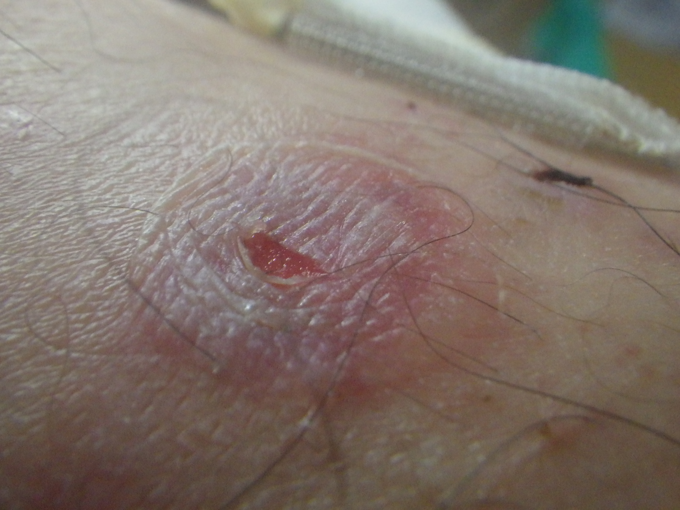 水泡ができたのは右足ですが、左足も見てかさぶたができていること、この部分は普段ズボンをはいていることから、そしてかゆみや痛みがないことから、虫刺されではなくやはり靴下の摩擦によるものだろう、ただこれだけ大きくなっているので潰しましょう。てことで、その場(診察室)で注射針を刺して潰しました。注射針を刺したときも全く痛くなかったです。