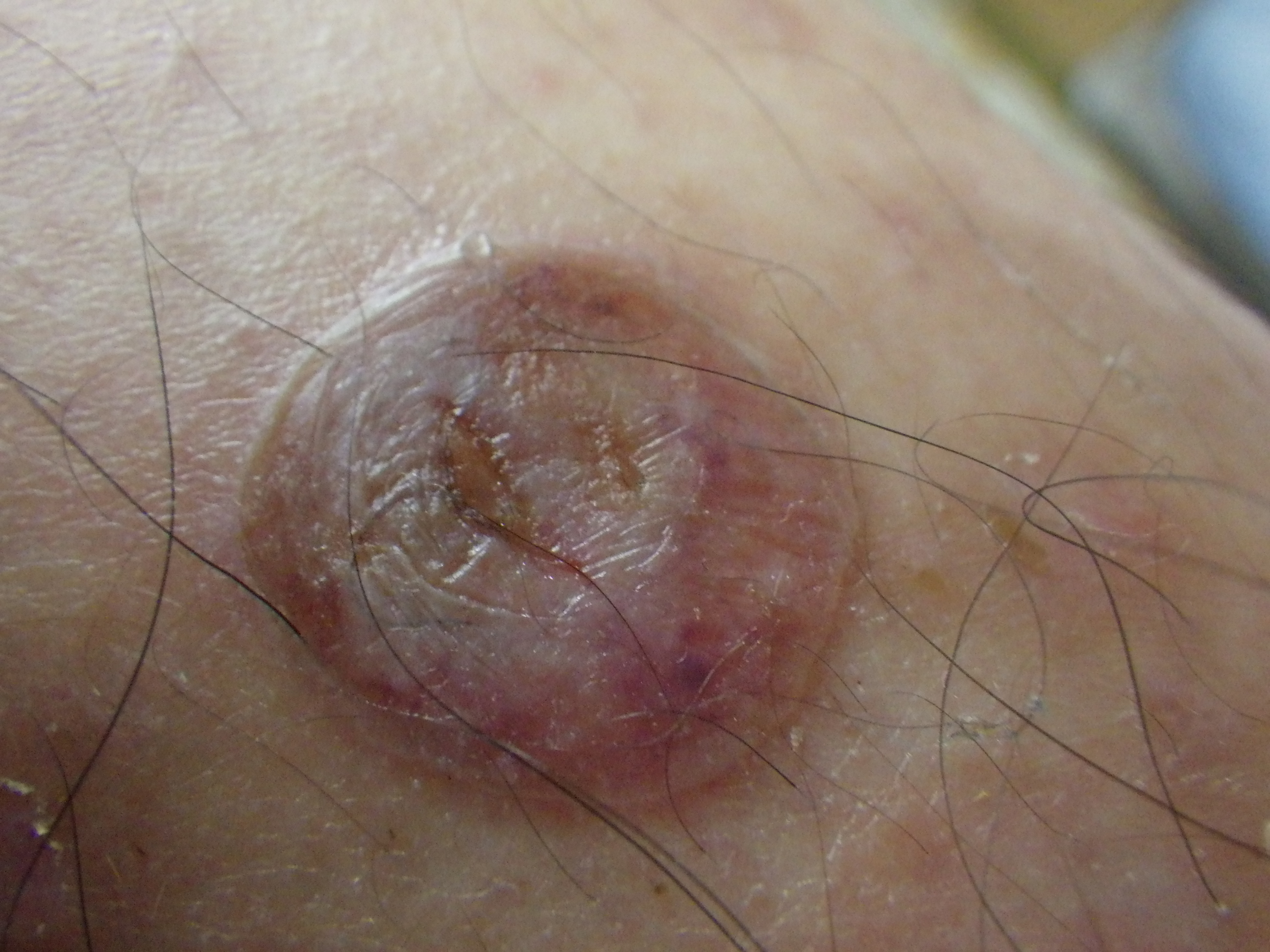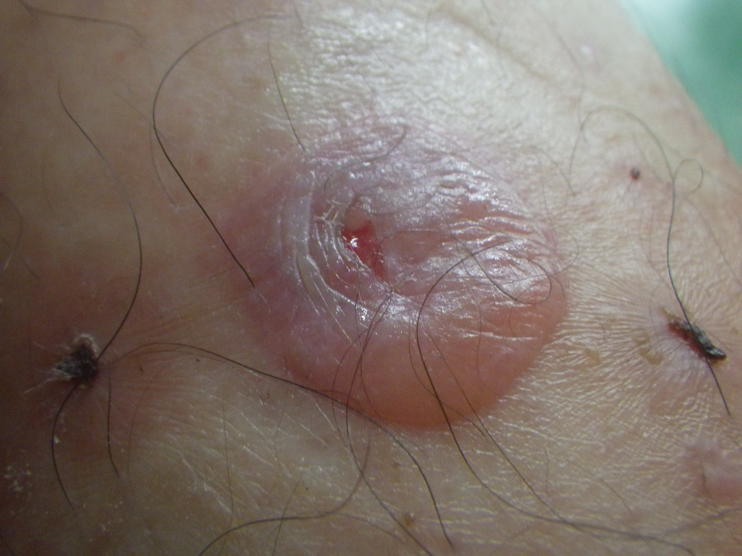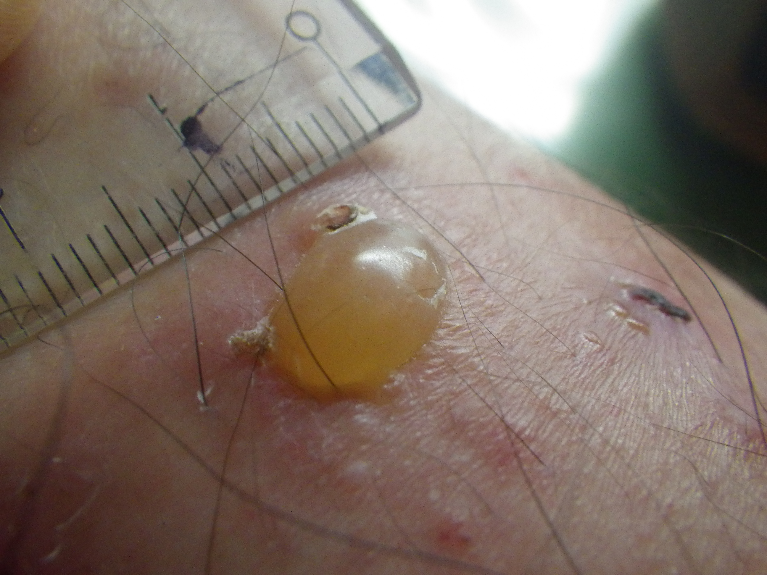 7月23日。見ると…こらまた立派な水泡(水ぶくれ)ができていました。膿疱ってやつだな。直径7~8mmというところでしょうか。
