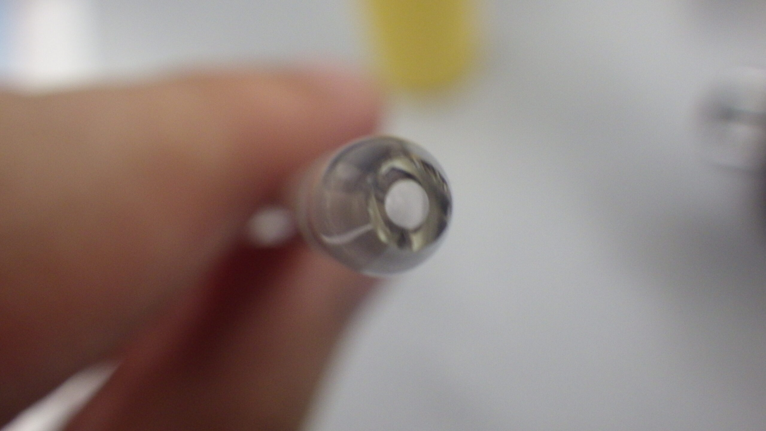 空気が気体採取器側に流れるので、シリンジの空気が減っていくのですが、50mL入れたのに40mLのところまで進みました。つまり60mL分の空気が使われたということになります。