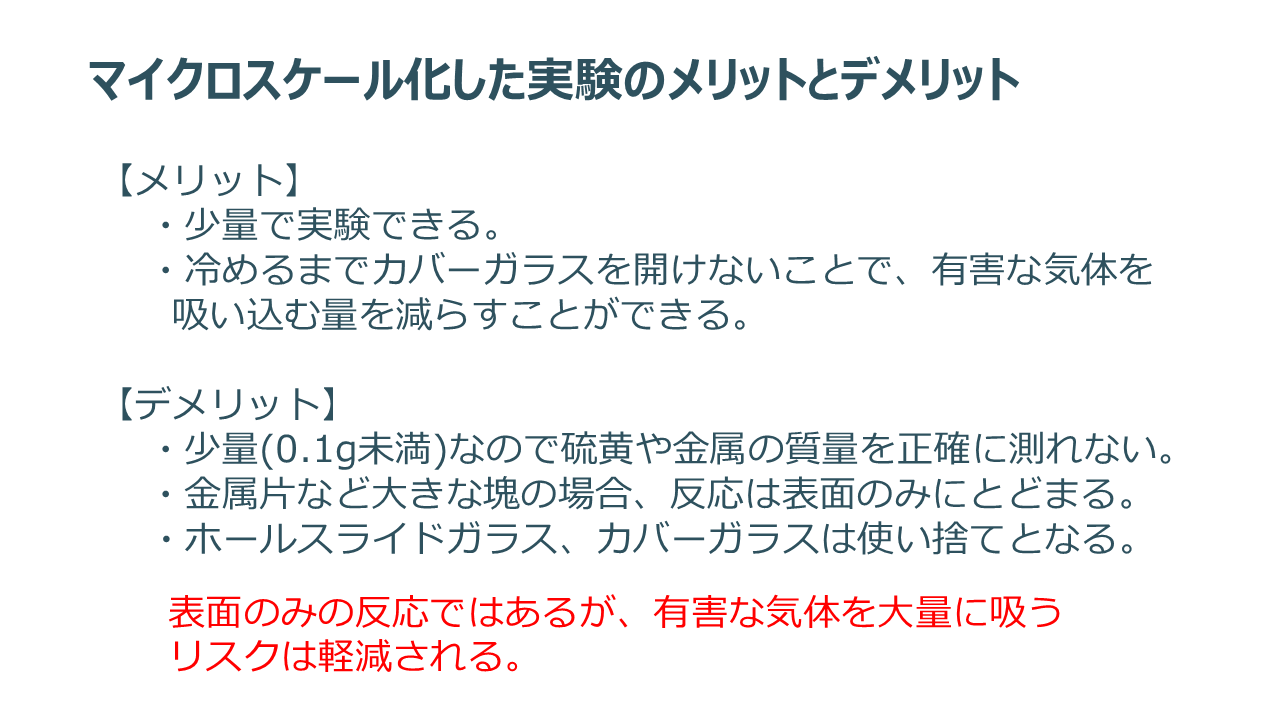 以上の実験を通してマイクロスケール化した実験のメリットとしては、マイクロスケール実験の本質ともいえる少量で実験でき、有害な気体が発生したとしても少量にとどまる点に加え、加熱後冷めるまでカバーガラスを開けないことで、有害な気体を吸い込む量を減らすことができます。