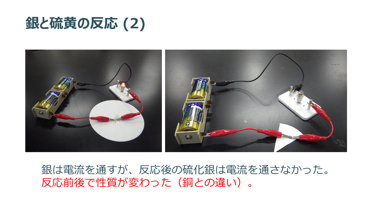 そして反応前の金属の銀は電流を通しますが、反応後の硫化銀は電流を通しませんでした。こちらは反応の前後で性質が変わったため、違う物質となったことが分かります。