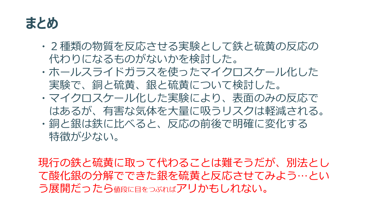 ここまでをまとめますと、本研究では、2種類の物質を反応させる実験として鉄と硫黄の反応の代わりになるものがないかを検討しました。具体的にはホールスライドガラスを使ったマイクロスケール化した銅と硫黄、銀と硫黄を結び付ける実験がその候補として耐えうるかを検証しました。