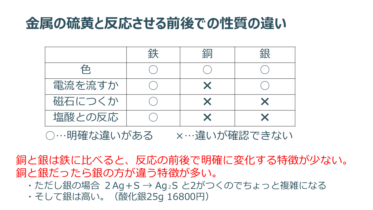 銅や銀ならば、銀の方が実験に使えそうですが、化学変化をモデルや化学反応式で表そうとすると、鉄や銅ならFe+S→FeS、Cu+S→CuSと原子1個ずつがくっつく形になるのですが、銀の場合は2Ag+S→Ag2Sと、少し複雑になります。また、銀を使う場合、価格という大きな問題点があります。