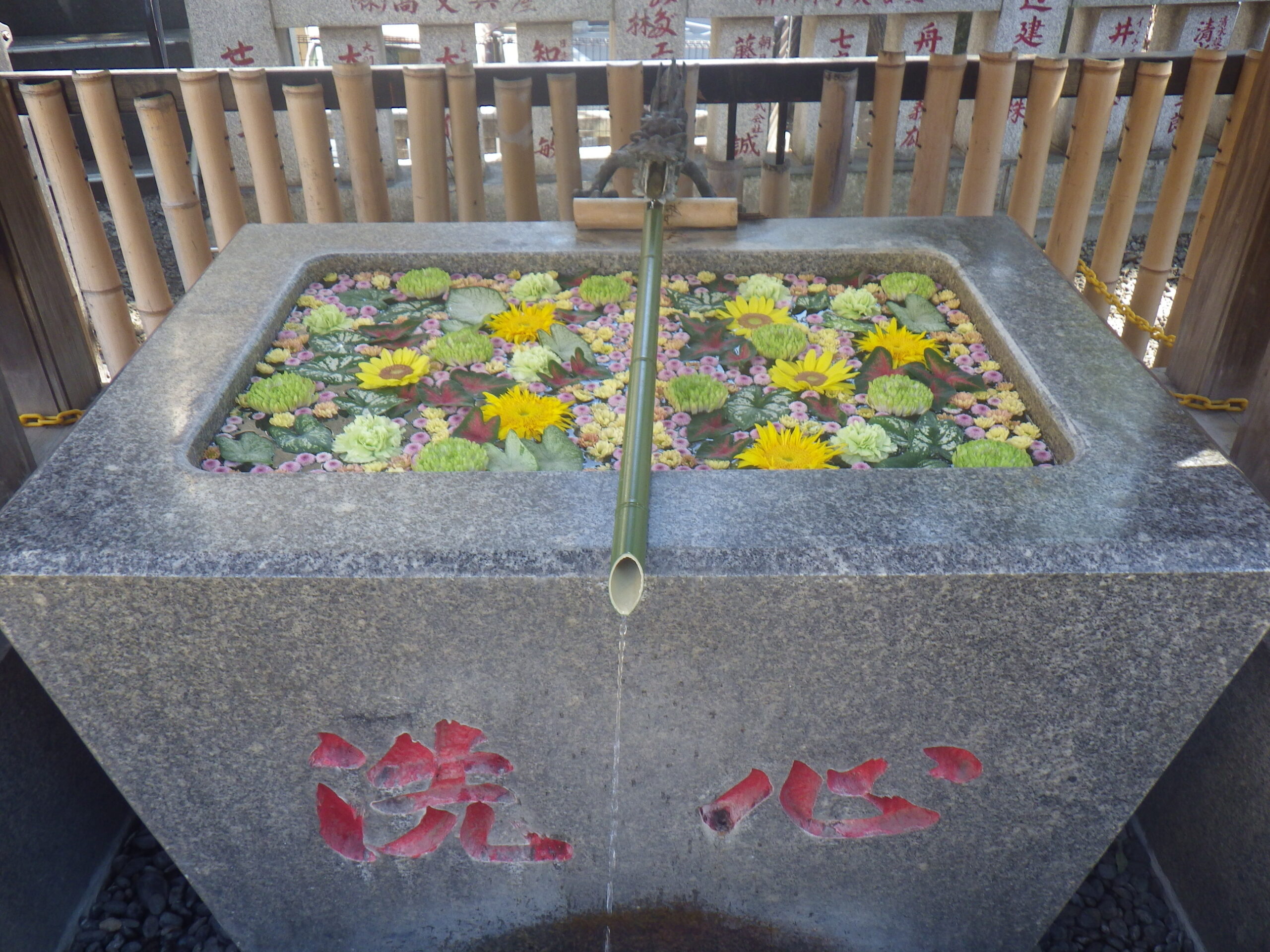 手水舎。花がきれいです。