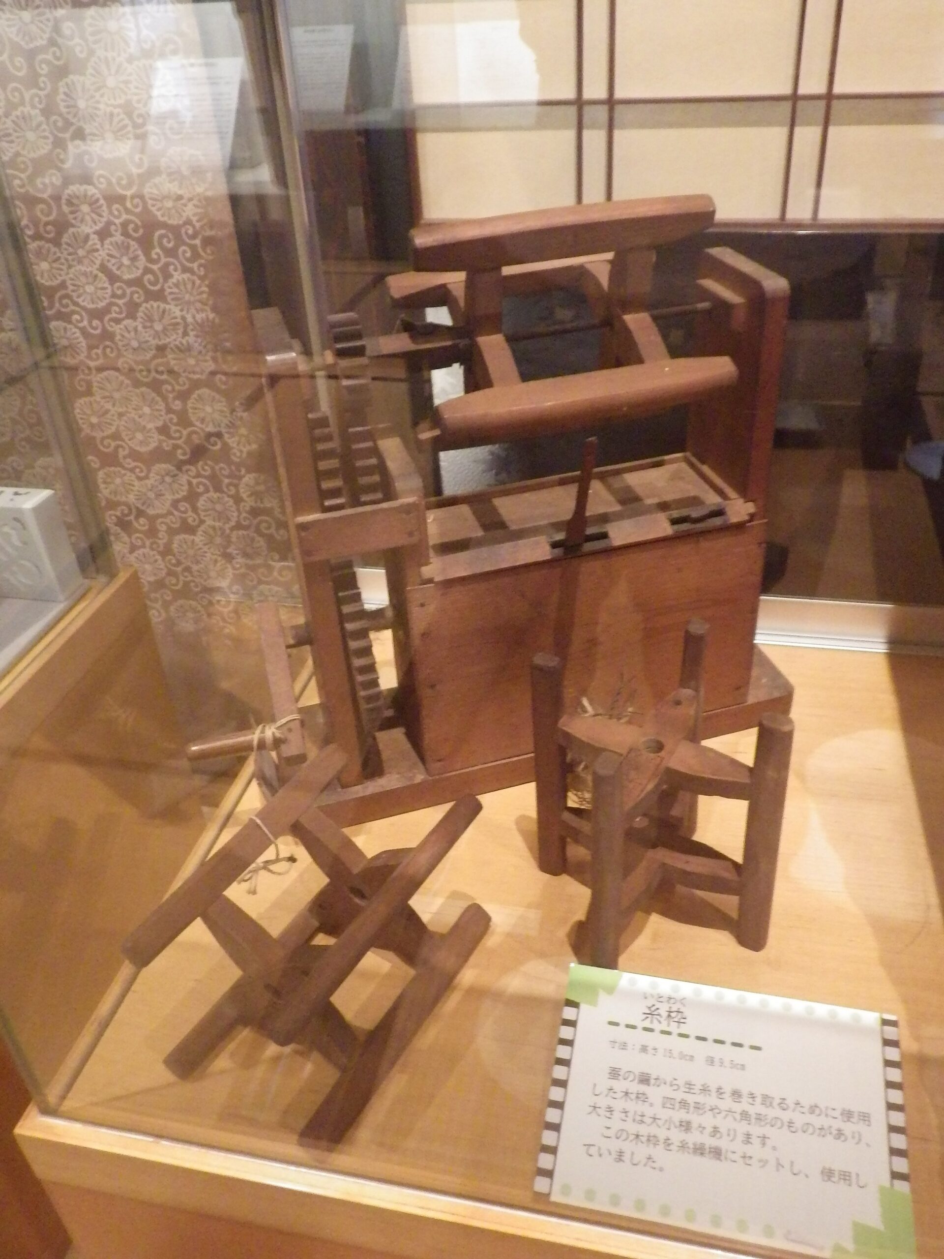 繭から生糸を取るときに使う道具。糸枠は四角形や六角形のものがあり、大小も様々。糸繰機に糸枠をセットして使う。