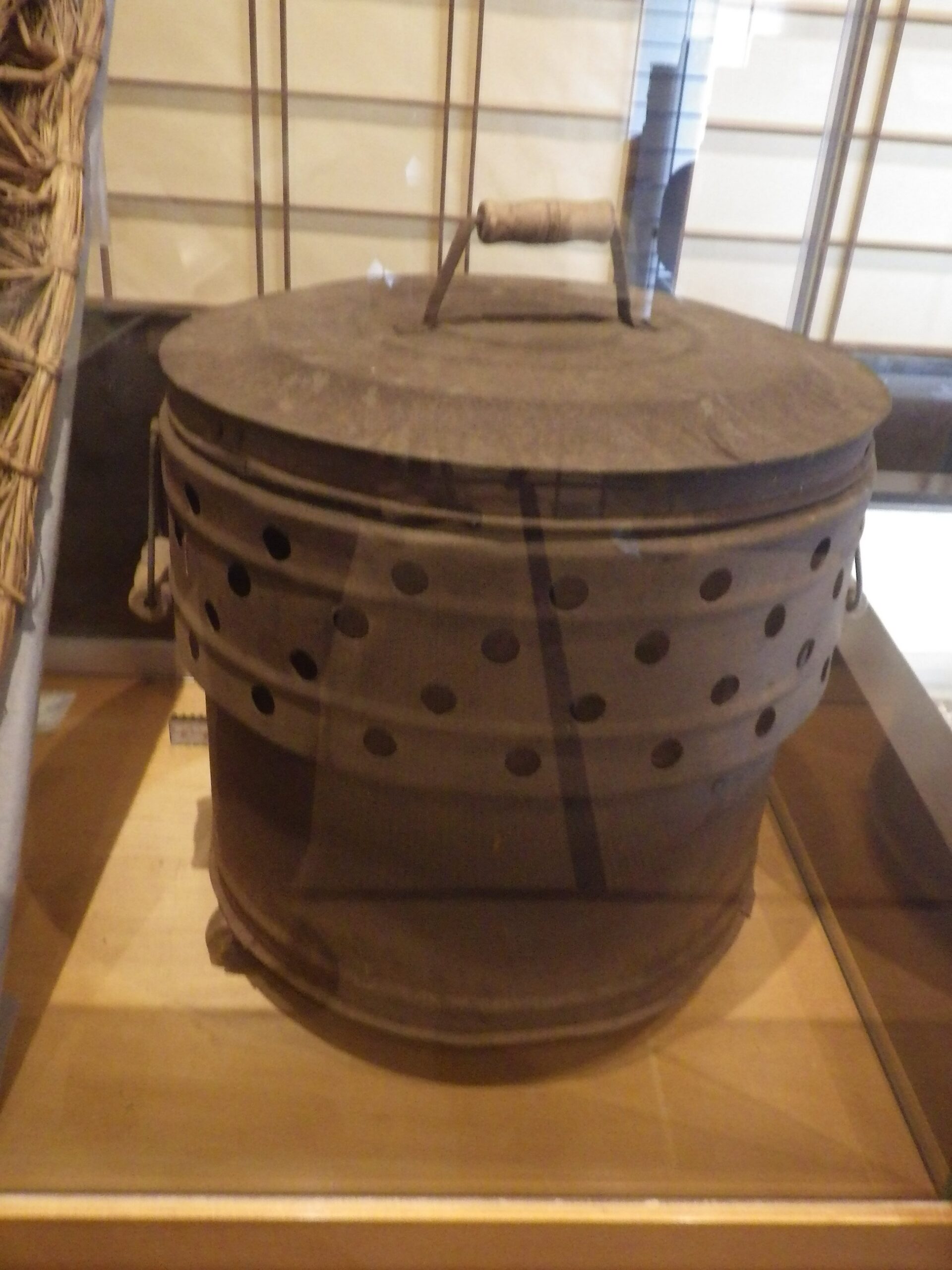 蚕を育てる部屋・蚕室きんしつを温めるための道具。中に炭火を入れる。