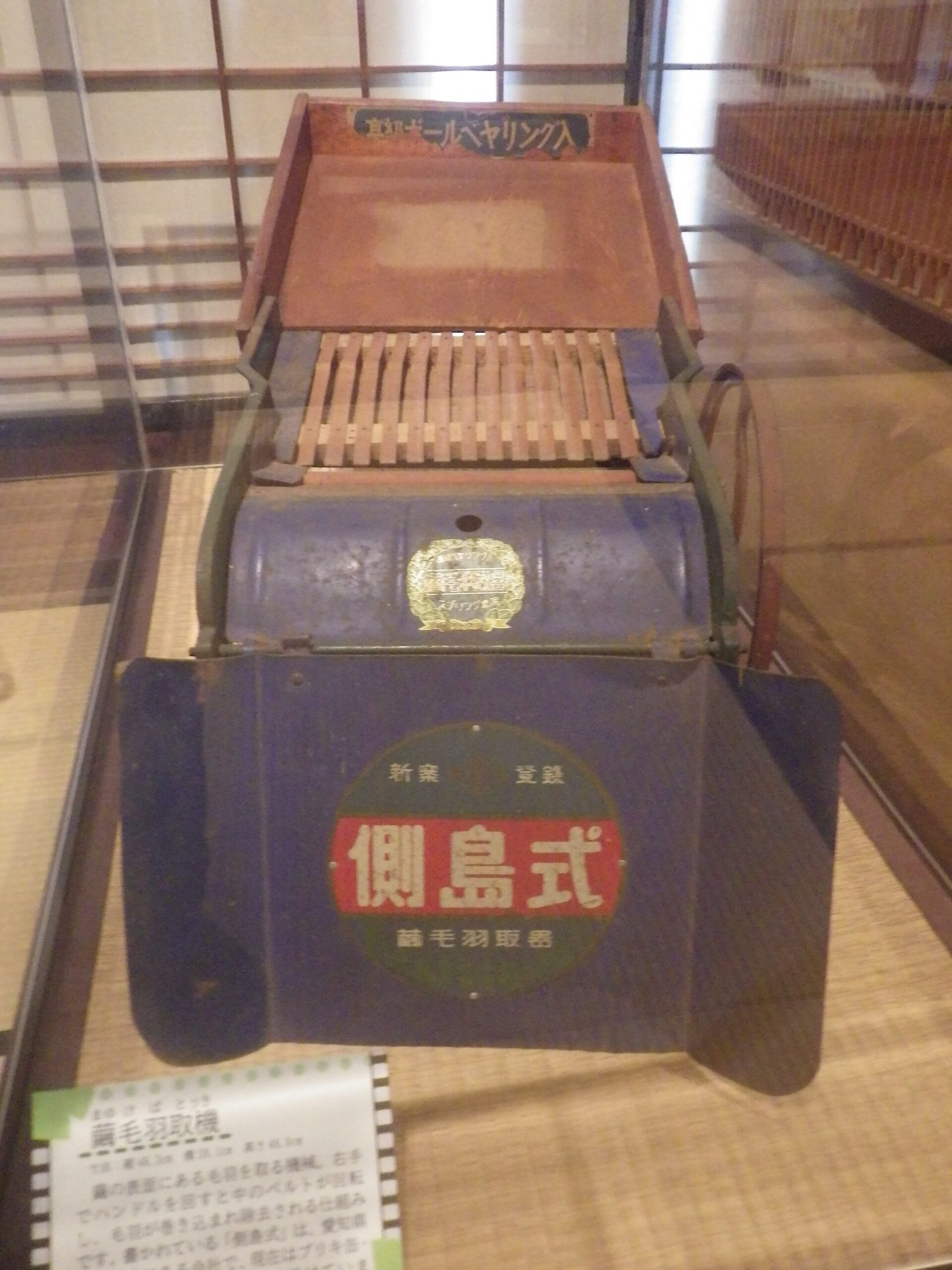 繭の表面にある毛羽をとる機械。右手でハンドルを回すと、中のベルトが回転し、毛羽が巻き込まれ除去される仕組み。「側島式」は名古屋にある側島製缶のこと。