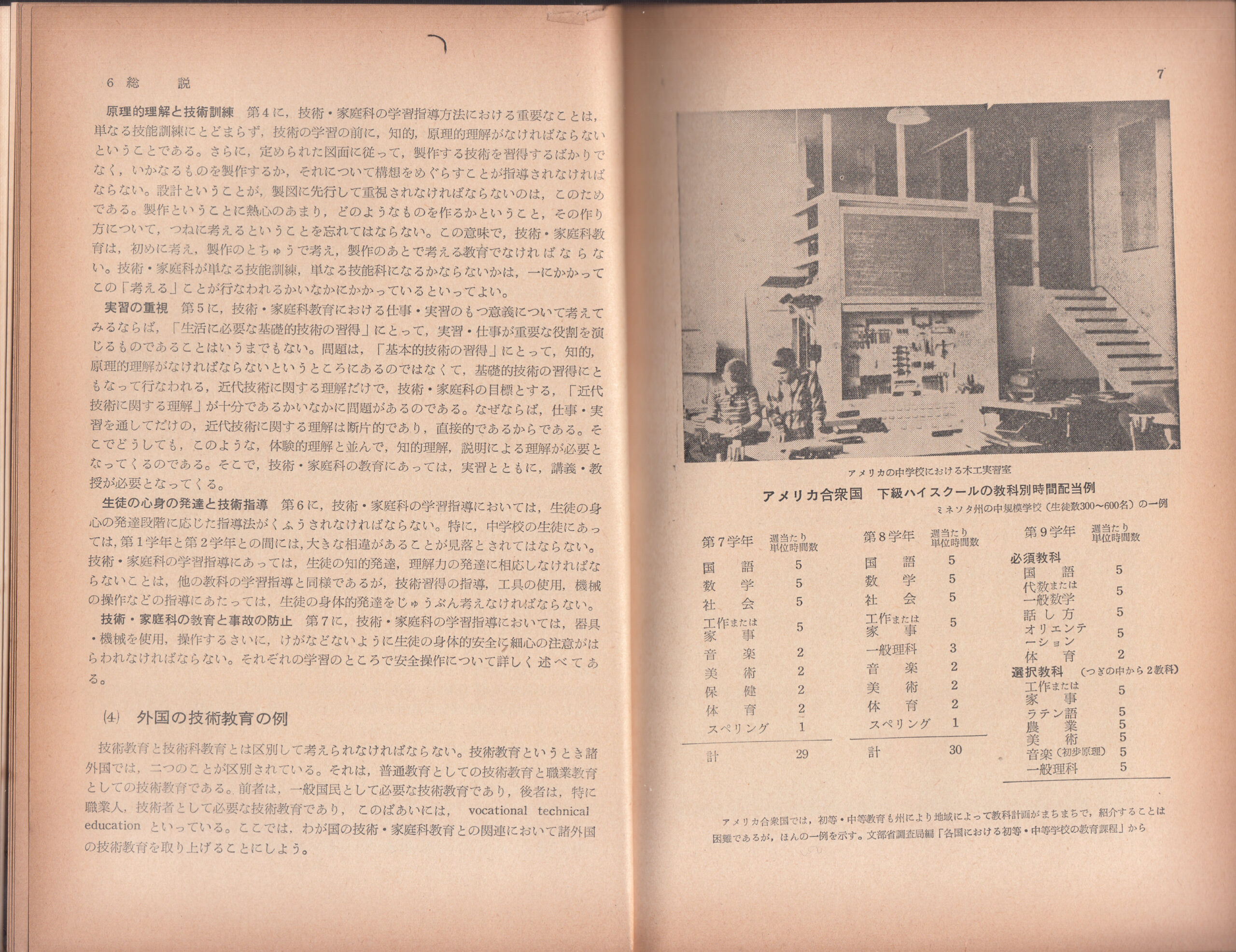 同年に発行された教育出版の指導書と同様、まず最初は新教科「技術・家庭科」の解説から始まっています。やはり職業教育ではなく、生活に必要な基礎的技術の習得という必修の普通教育というスタンスが強調されています。さらにこの講談社版では、「職業・家庭」から「技術・家庭」へドラスティックに変わったということでそのあたりの経緯を「各分野の勢力争い」「家庭科教育がむりに職業科に編入された」など少々ぶっちゃけて解説され、また海外の技術教育について紹介されています。