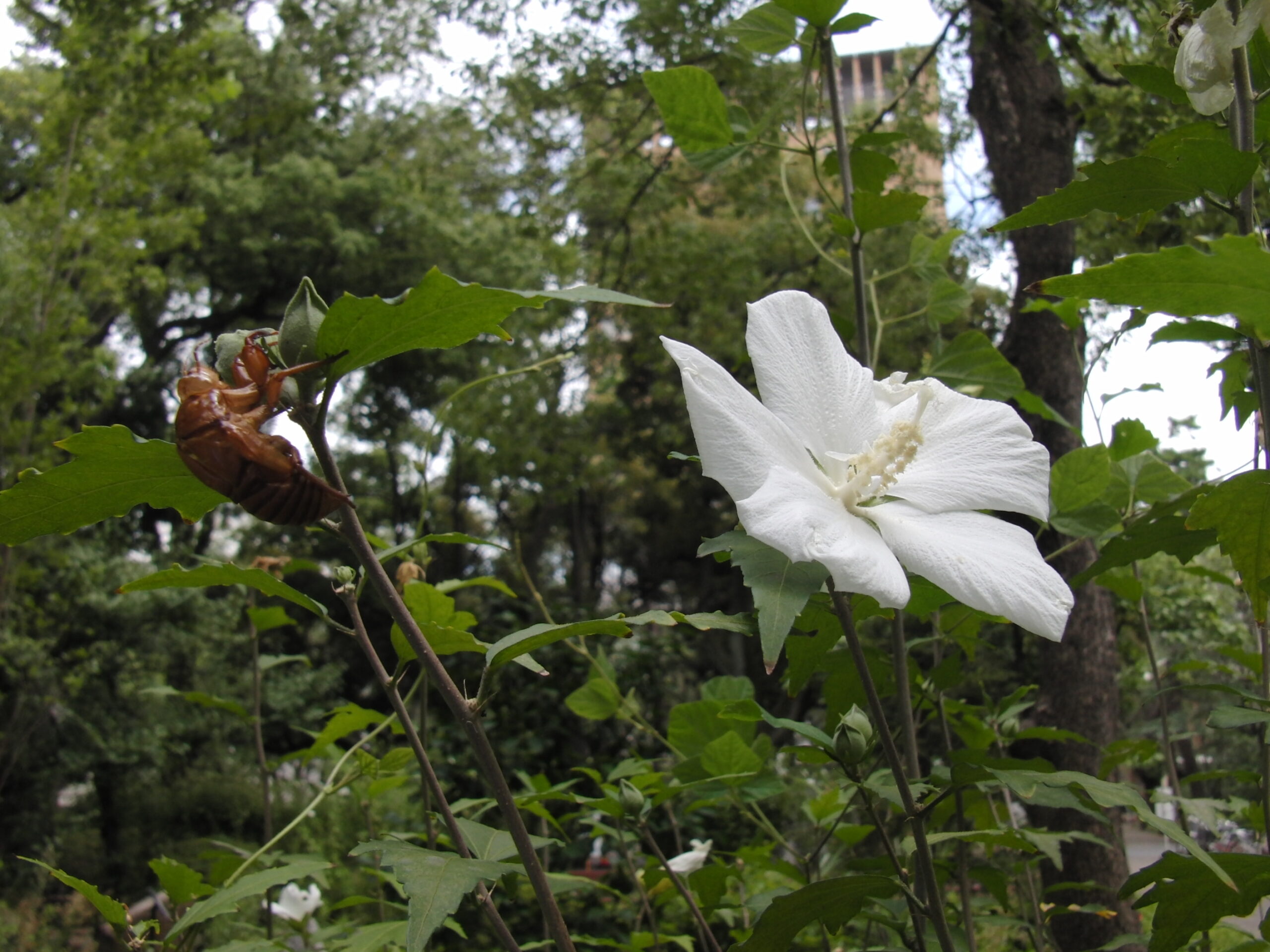 おまけ。お昼休みにとったセミの抜け殻とムクゲ。
