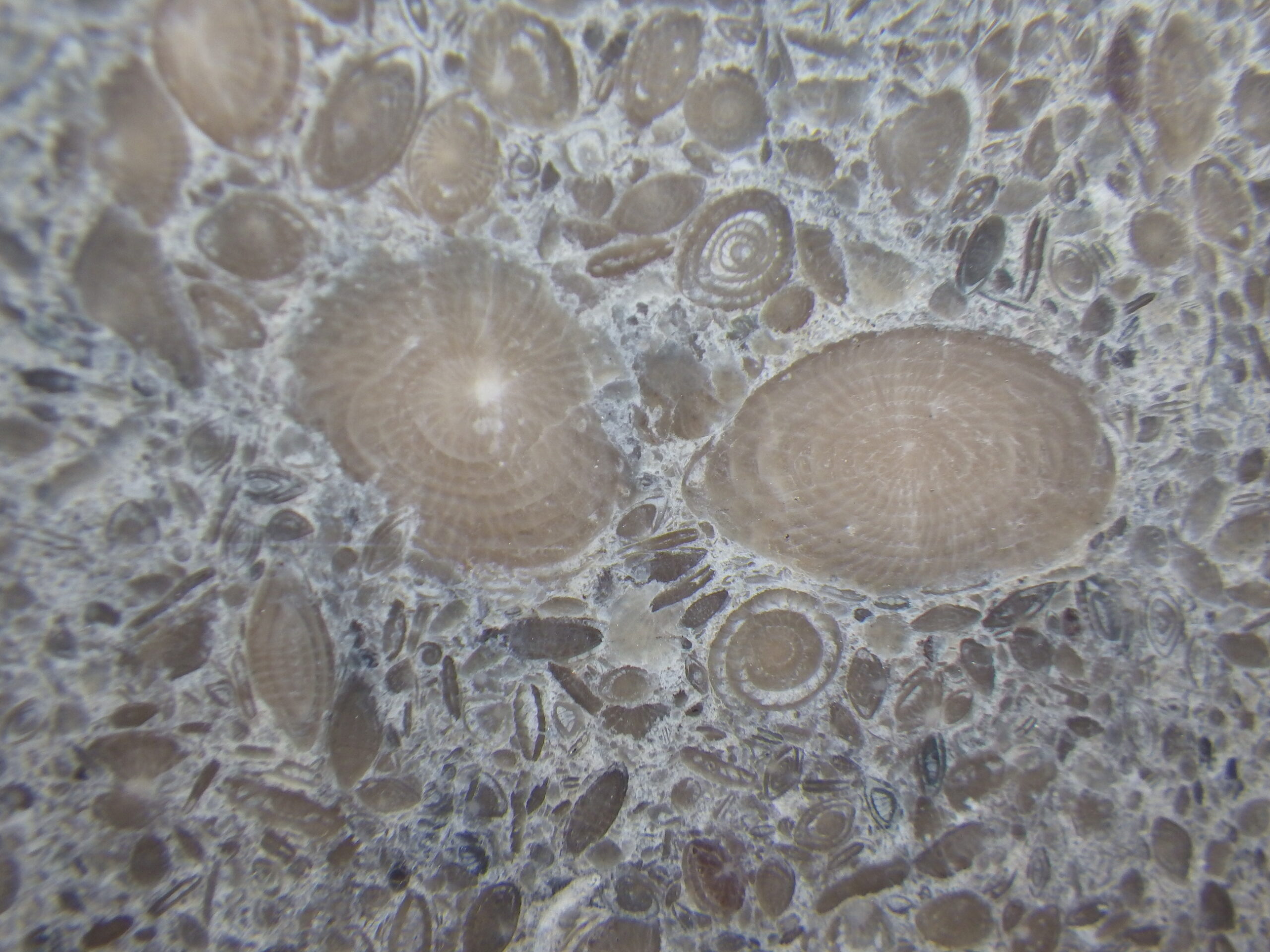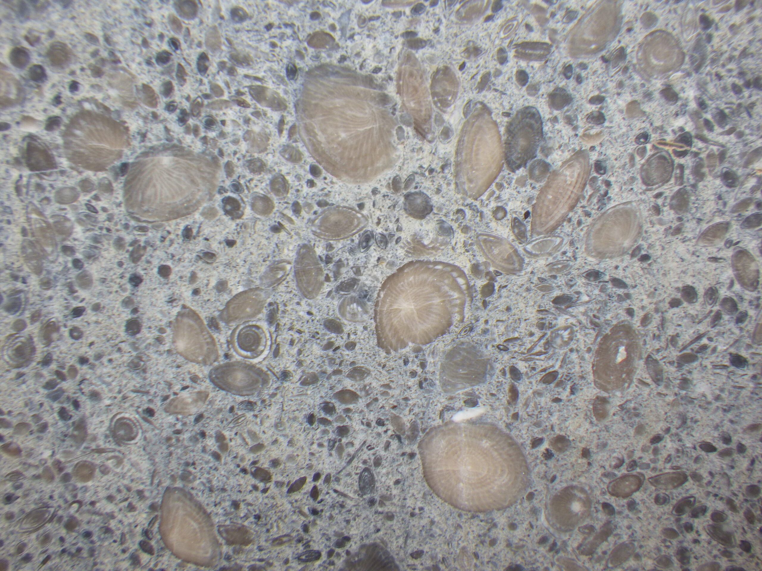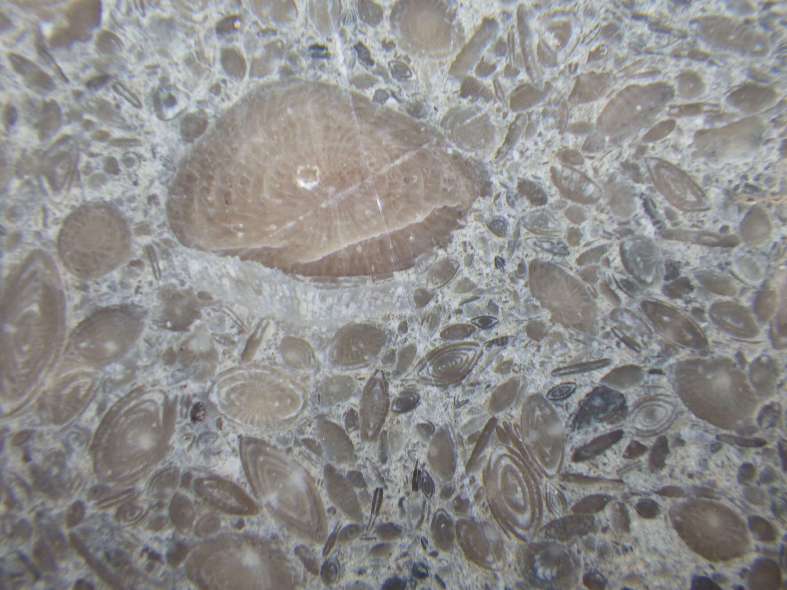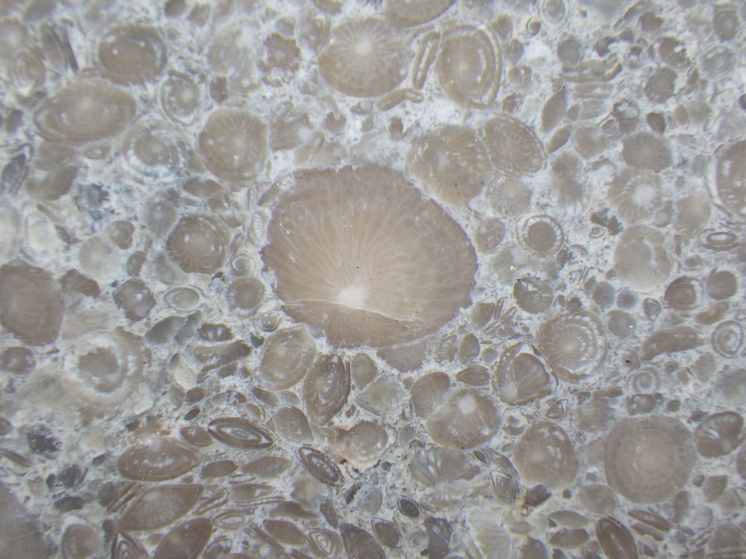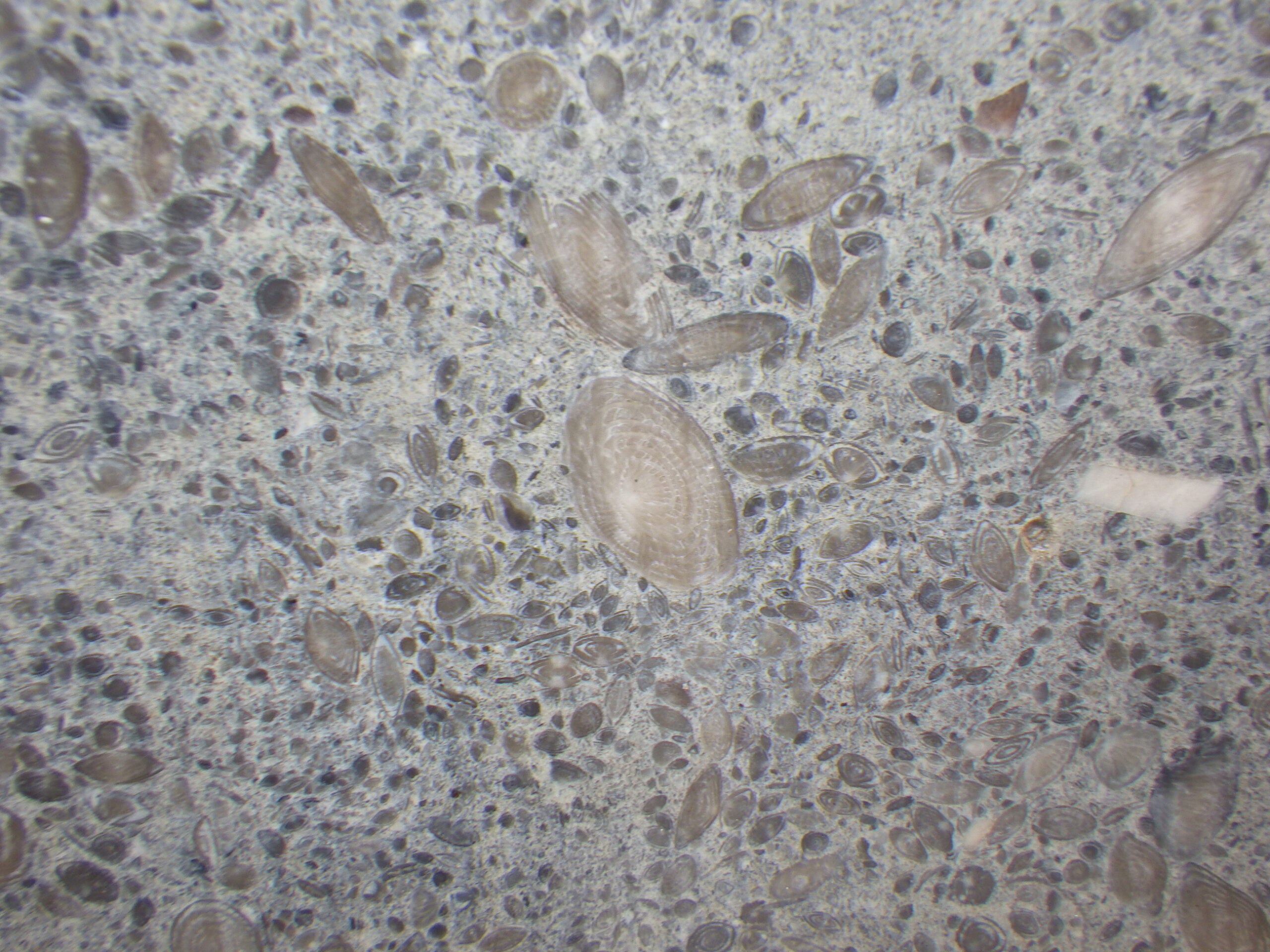 そのビルの外壁。一見ただのコンクリの打ちっぱなしか、と思ってよく見ると、フズリナのオンパレード。いずれも1cmに満たない小さなものばかりですが、果てしなくたくさんあります。必見!