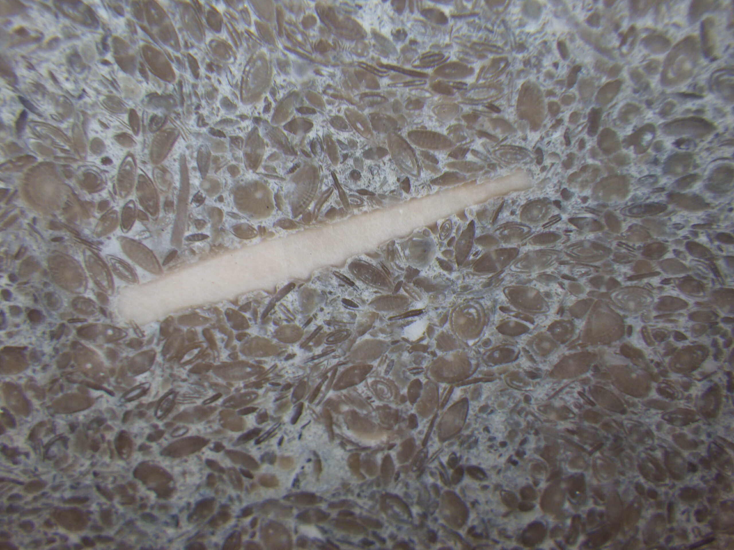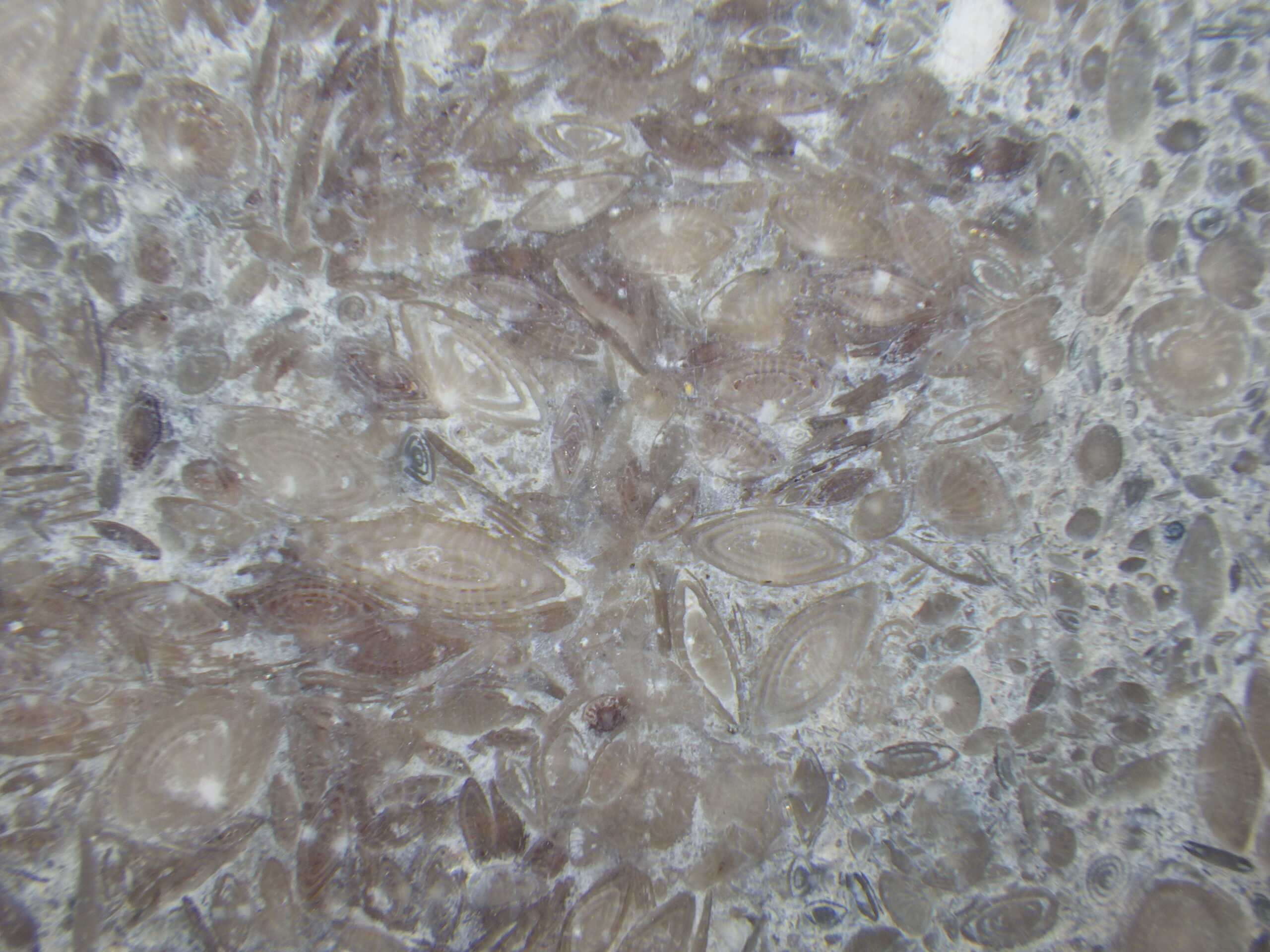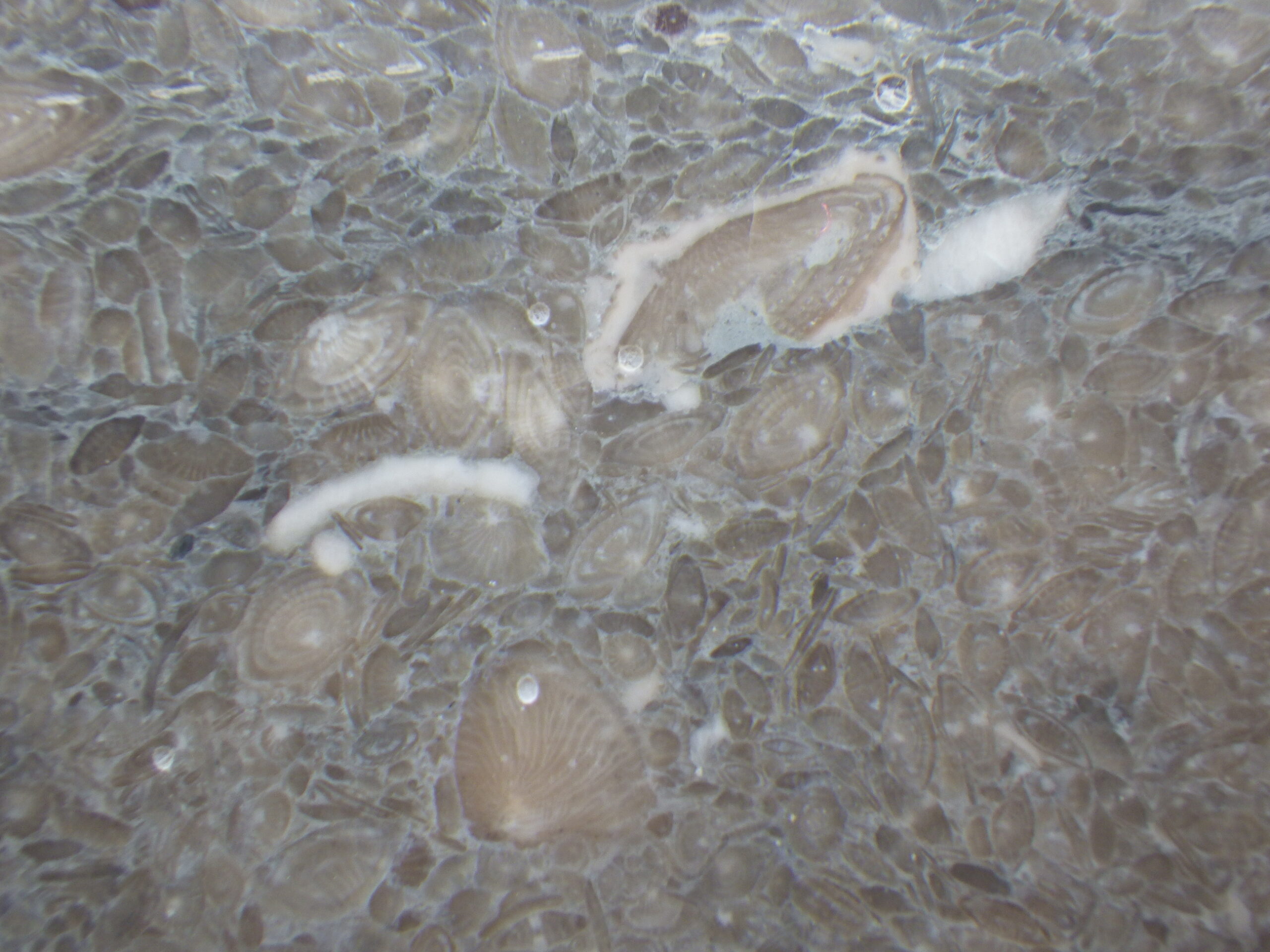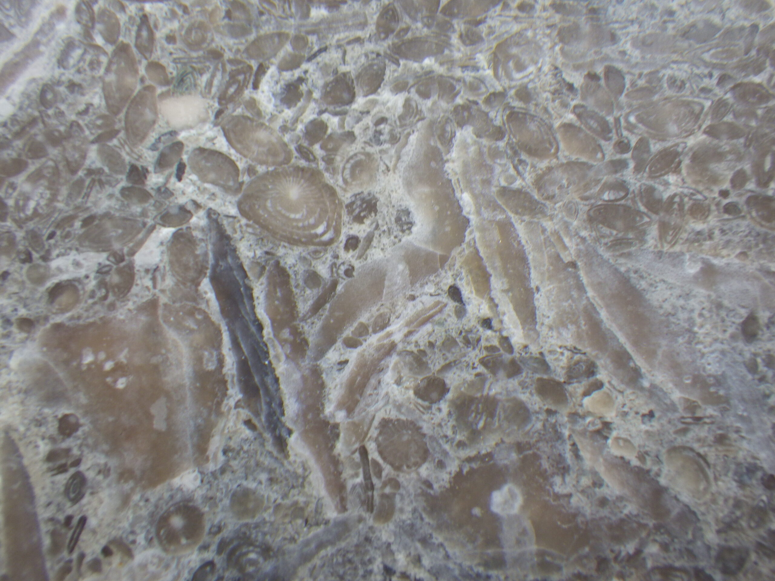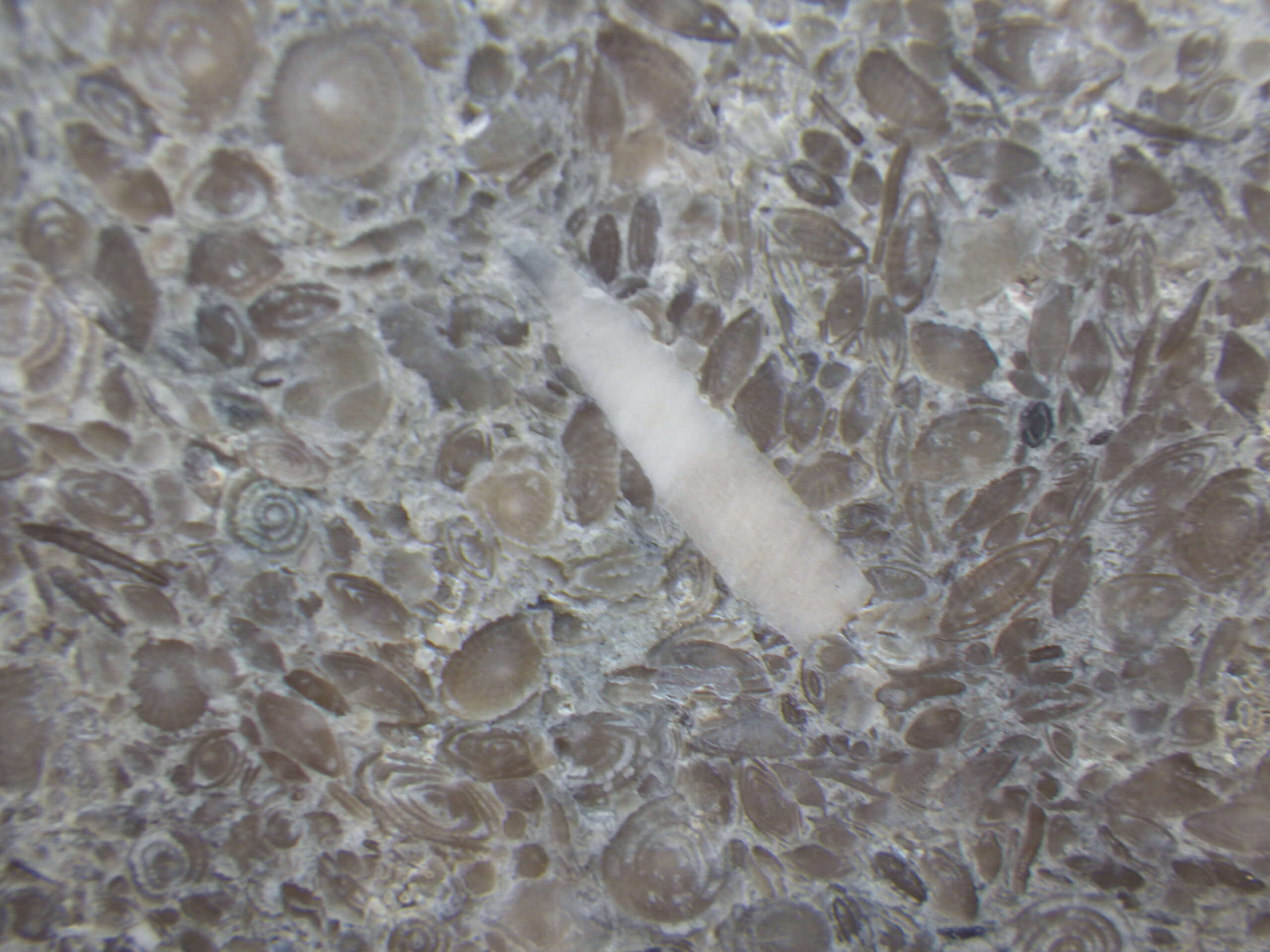 そのビルの外壁。一見ただのコンクリの打ちっぱなしか、と思ってよく見ると、フズリナのオンパレード。いずれも1cmに満たない小さなものばかりですが、果てしなくたくさんあります。必見!