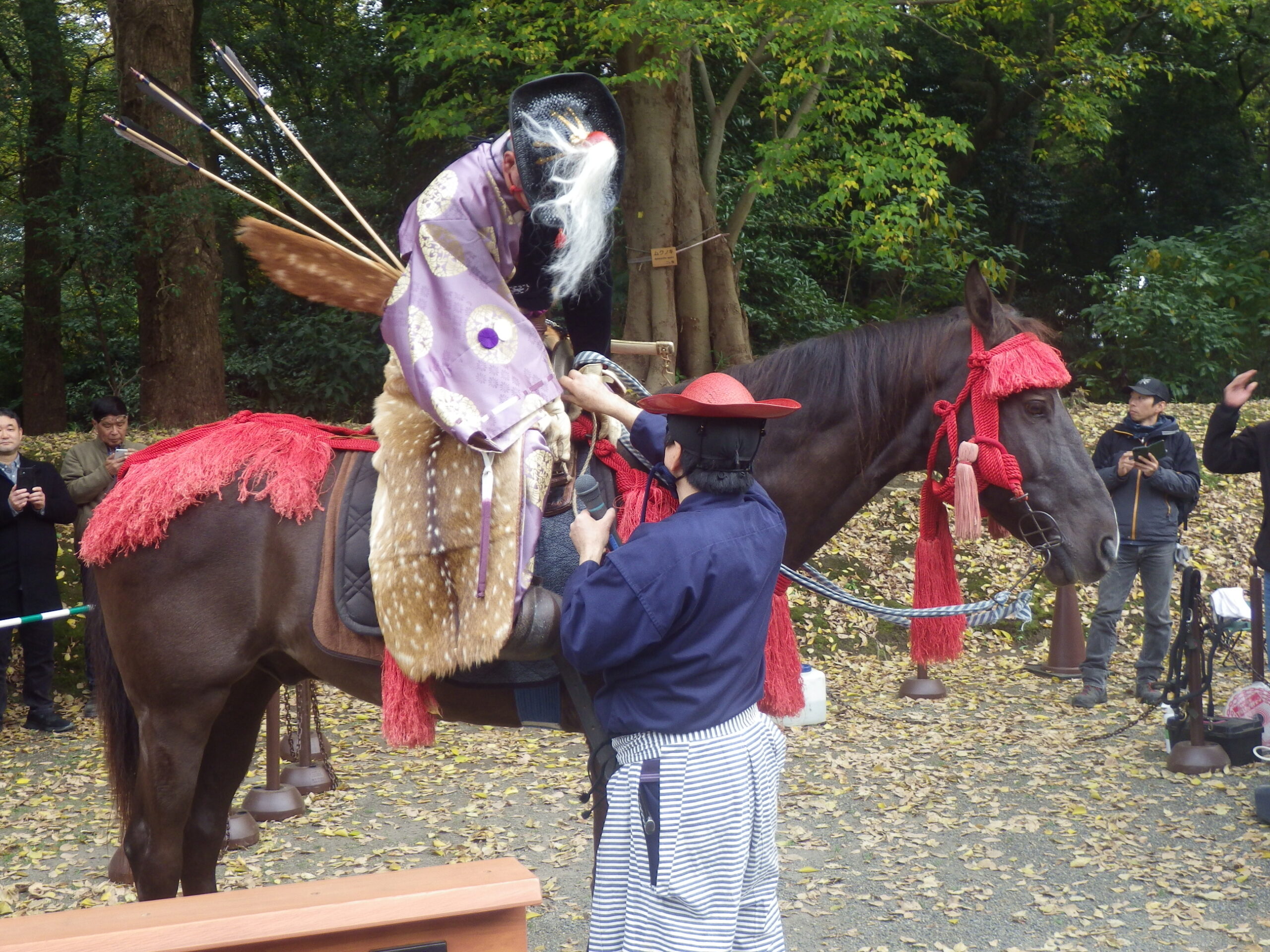 西洋だと馬の左側から乗りますが、和式だと刀の関係で右側から乗ります。ちなみに馬に乗っている人が来ているのが流鏑馬装束やぶさめしょうぞく