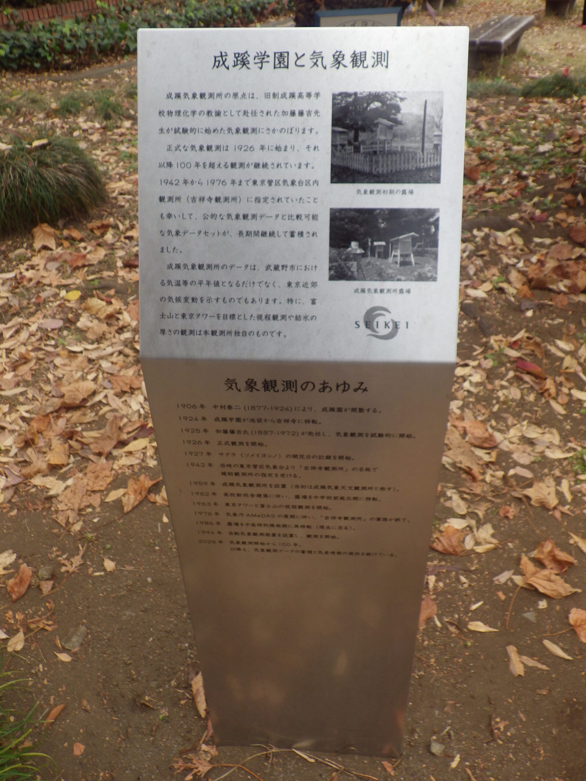 資料館の近くにあった「成蹊学園と気象観測」モニュメント。どうも設置したばかりらしい。