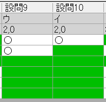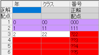 結果はこちら。一番左の列、正解、配点の下の数字が答案番号で、上から白、アイボリー、赤、黄、緑、青の答案用紙のデータの行です。