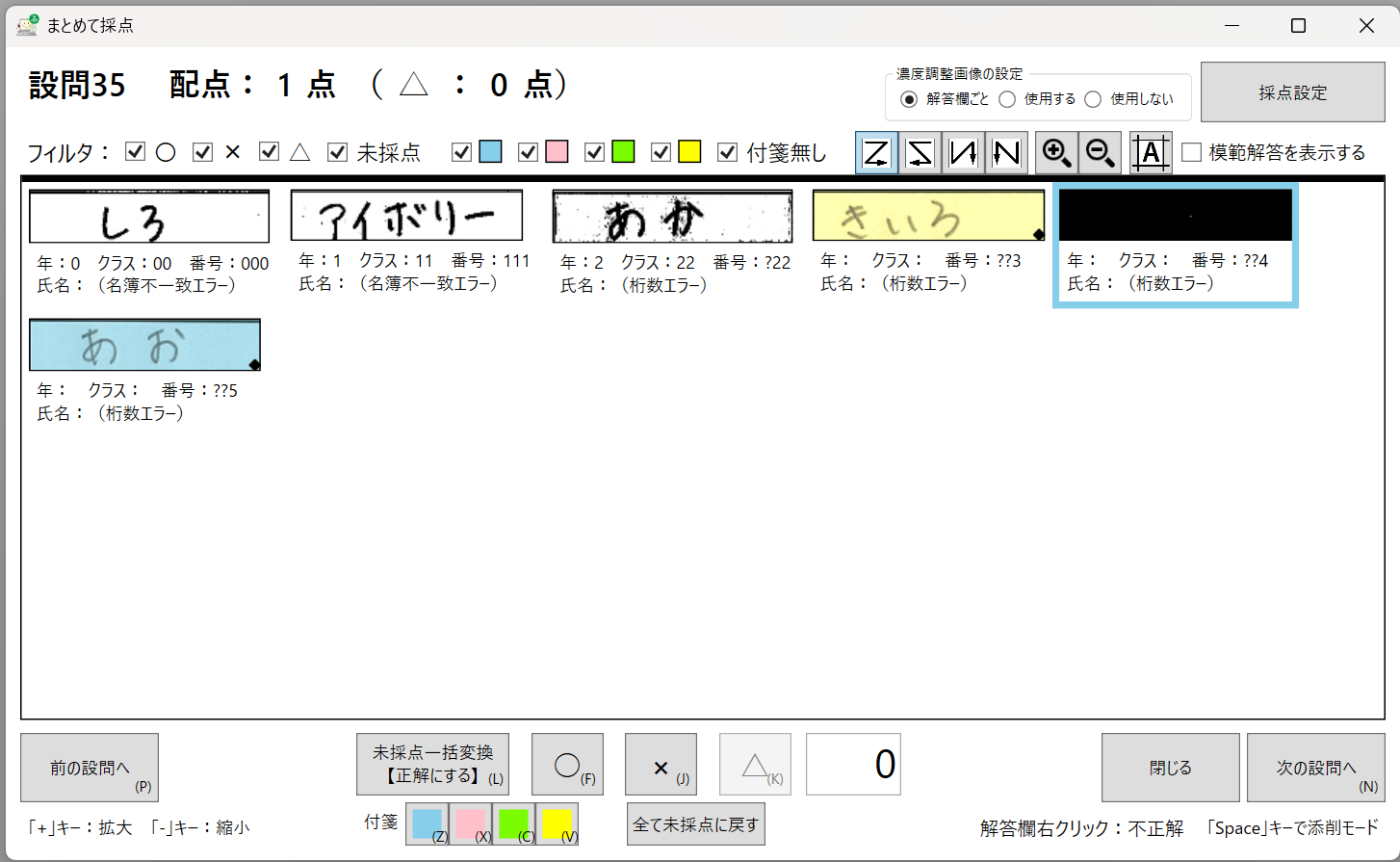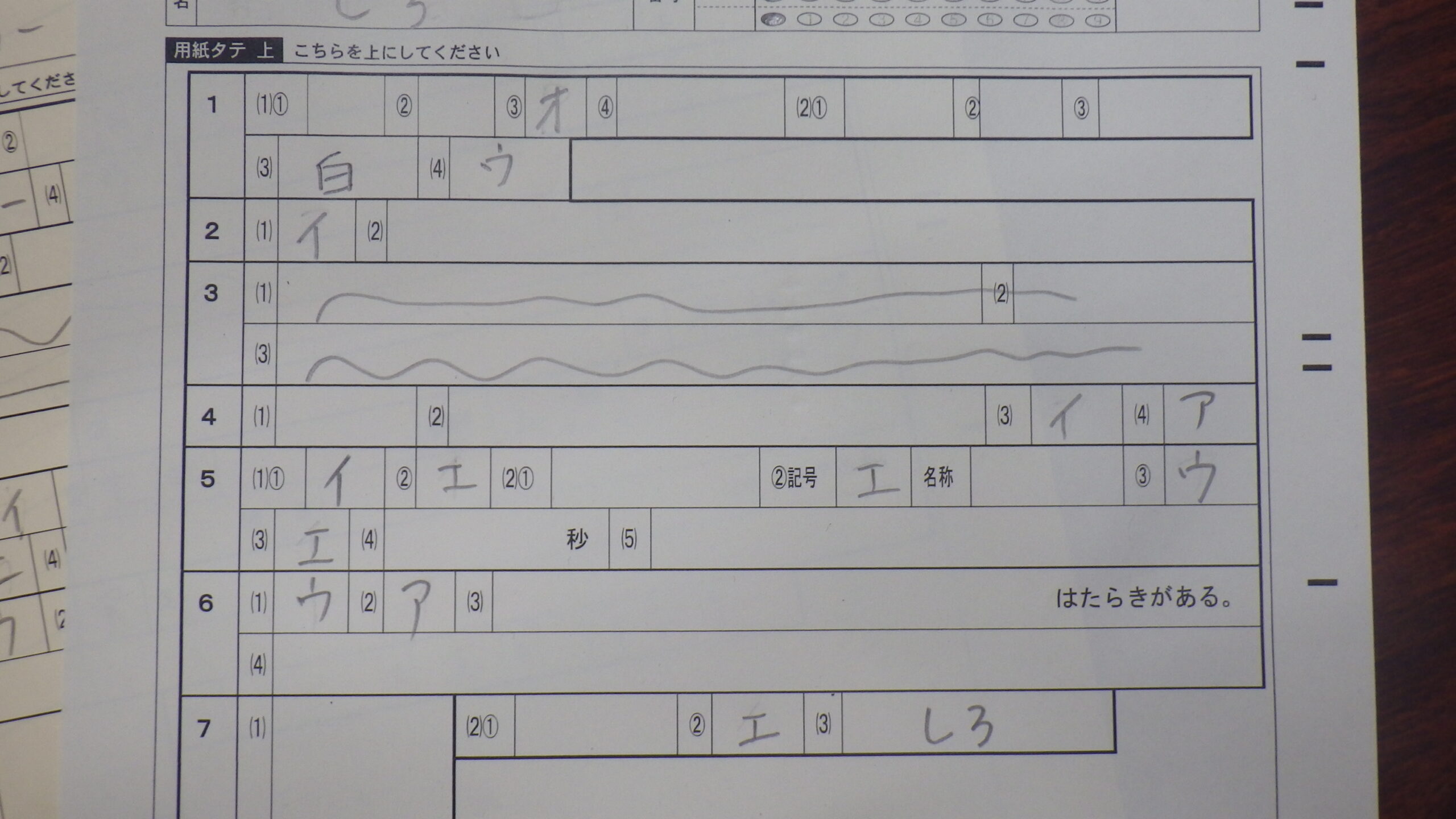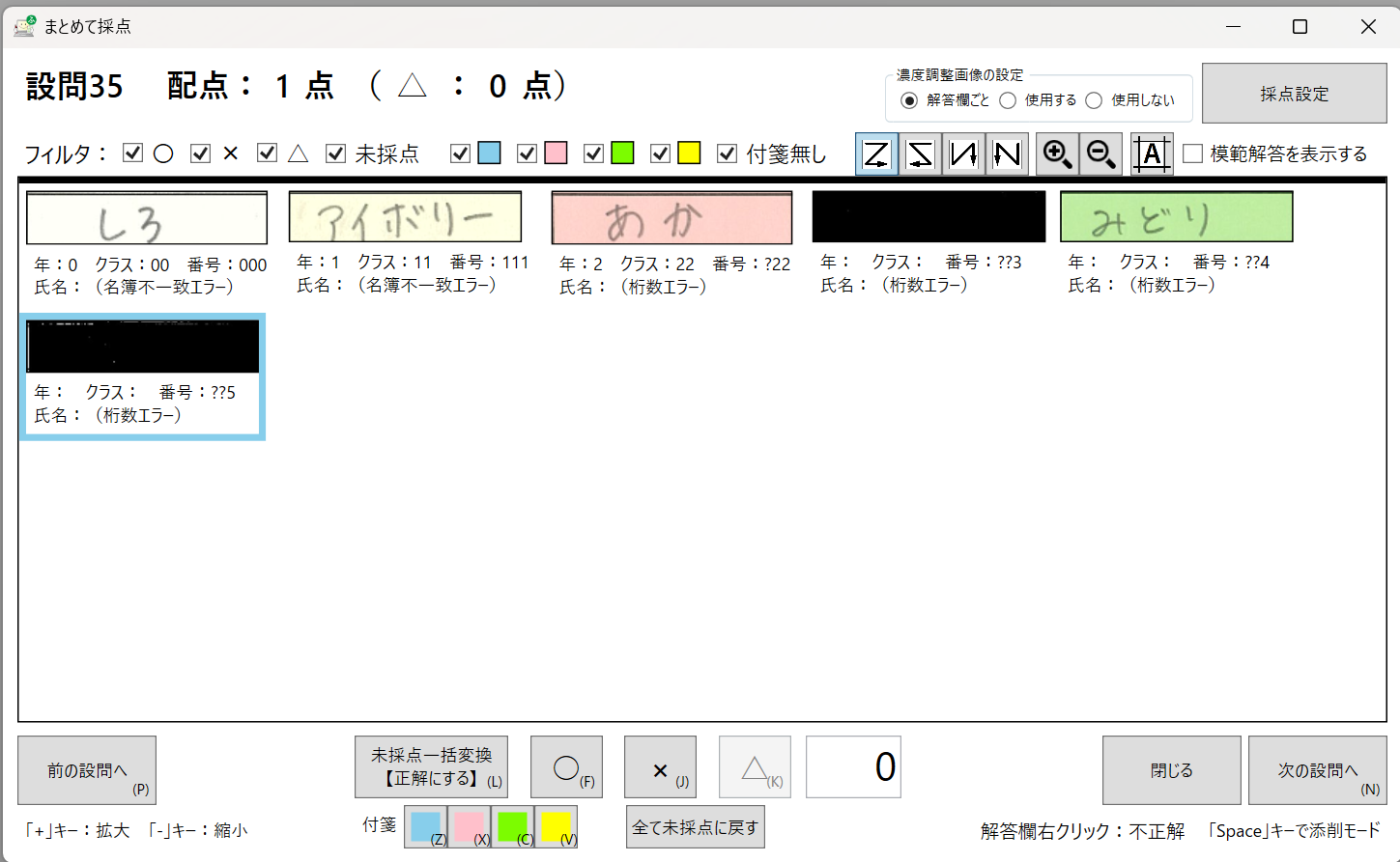 マーク欄にマークをしたり、記述欄に解答を書いてみたりした。ちなみに、採点システムにはOCR機能もあって、1文字のひらがな、カタカナ、アルファベット、数字なら読み取って採点してくれる。ま、正解を間違えとすることはあるが、間違えを正解とすることは今までなかったので、システムが間違いと判断したのを再確認すれば事足りる。なんつーか、技術は突破する。