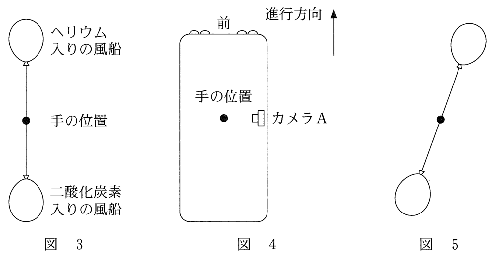 問3 二酸化炭素入りの風船とヘリウム入りの風船に軽い糸を取りつけ、バスの中でのそれらの動きを考える。二つの風船の糸を結び,その結び目をバスに乗っている人が片手で握り。動かないようにした。バスが静止しているときは, 図3のように,二酸化炭素入りの風船は鉛直下向きにぶら下がり,ヘリウム入りの風船は鉛直上向きに浮いていた。図では手の代わりに黒丸(●)を描いている。バスの窓は閉じられていて。外からの空気の流れはなかった。 バスが直線道路を一定の加速度で速さを増しているときに、バスに乗っている人には二つの風船はほとんど止まって見えた。このとき図4のように車内の右側に取りつけられたカメラAで撮影された風船の様子は。図5のようで あった。