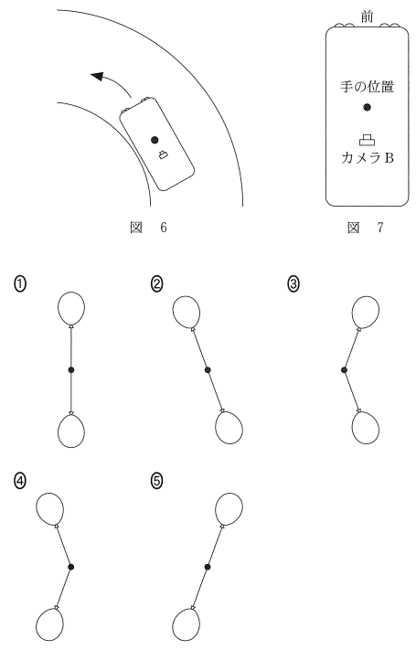 次に、図6のようにバスが一定の半径の左カーブを定の速さで進んでいるときに、バスに乗っている人には二つの風船はほとんど止まって見えた。このとき、図7のように風船の後ろ側に取りつけられたカメラBで撮影された風船の様子として最も適当なものを、後の①~⑤のうちから一つ選べ。