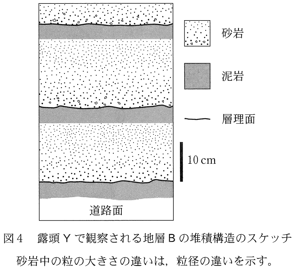 b このような堆積構造は、粒径の異なる粒子が水と混ざり合いながら運ばれ、粒径の大きい粒子がより速く沈んで堆積した際に形成される。