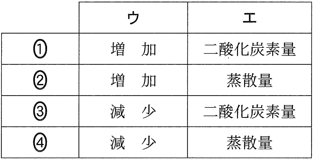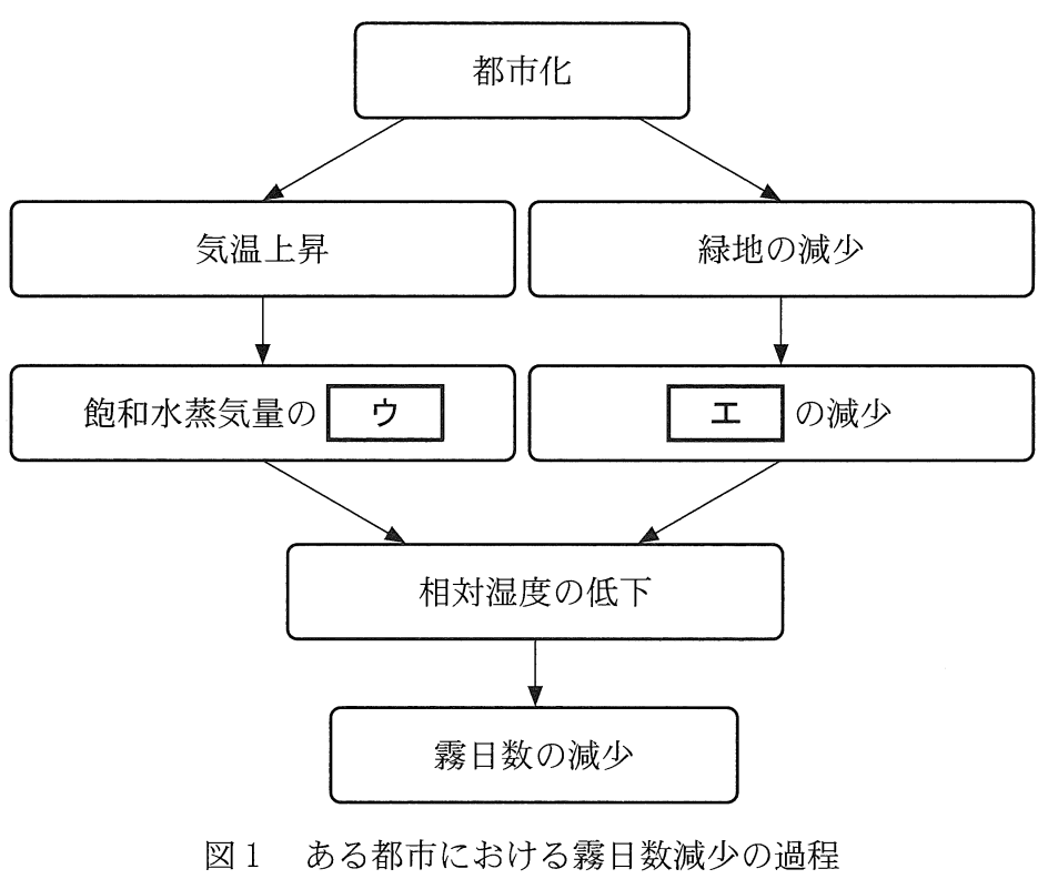 問2 かつての日本の都市部では大気汚染の影響で霧の発生が多かった。近年はキリが発生した日数(霧日数)は減少しており、それは大気汚染の改善だけでなく、都市化に伴う他の過程にもよると考えられている。たとえば、ある都市では次の図1のような家庭で霧日数が減少している。図1の[ウ]・[エ]に入れる語の組み合わせとして最も適当なものを、後の①~④のうちから一つ選べ。