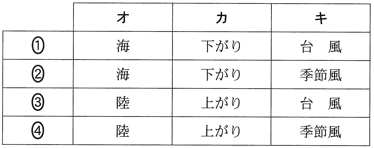 問4 陸塊風の仕組みを参照。昼間は海風ですね(オ=海)。地表が暖められて上昇気流おきて低気圧になります(カ=下がり)。これは、スケールを大きくすると季節風と同じですね(キ=季節風)。 ②