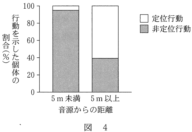 実験3 コウモリの超音波と同様な26キロヘルツの音を,野外で飛んでいるガに聞かせたときの行動を観察したところ,ガは音源から遠ざかる「定位行動」と旋回や急降下などの「非定位行動」を示した。ガがこれらの行動を示したときの音源からの距離を調べたところ、図4の結果が得られた。