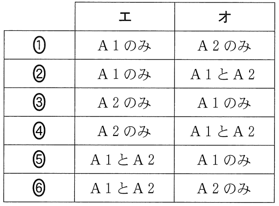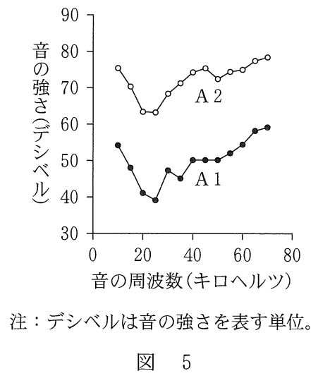 ガの胸部にある聴覚器官には,2種類の聴細胞(A 1 ・A2)がある。図5 は,A1 とA2のそれぞれが,様々な周波数の音に対して活動電位を発生する音の強さの最小値を示している。ガの聴細胞の興奮と実験3との関係について考察した,後の文章中の[エ]・[オ]に入る語句の組合せとして 最も適当なものを,後の①~⑥のうちから一つ選べ。