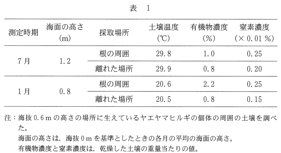 問2 下線部(b)に関連して,ヤエヤマヒルギの生育場所の土壌の特徴を調べるた め,海面の高さが異なる7月と1月に,ヤエヤマヒルギの根の周囲の土壌と, 根が生えていない離れた場所の土壌について,深さ15cm地点の土壌温度, 有機物濃度,および窒素濃度を測定し,表1にまとめた。表1の結果についての記述として最も適当なものを,後の①~④のうちから一つ選べ。
