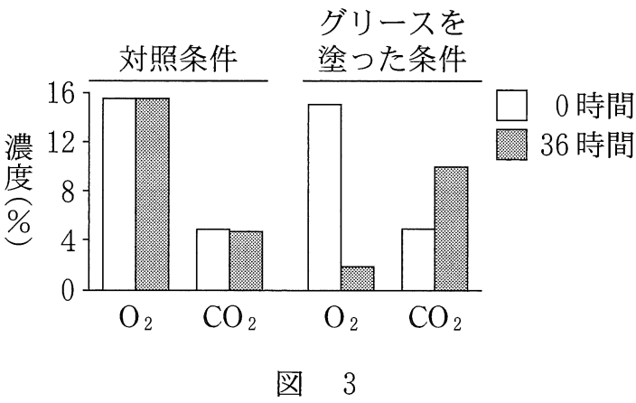 問3 対照実験で36時間では酸素、二酸化炭素とも変化していないのに対し、ワセリンを塗った方では二酸化炭素が増えて、酸素が減っている。つまり本当は根では呼吸をしているけど、酸素も二酸化炭素も皮目から出入り自由ということがわかります。