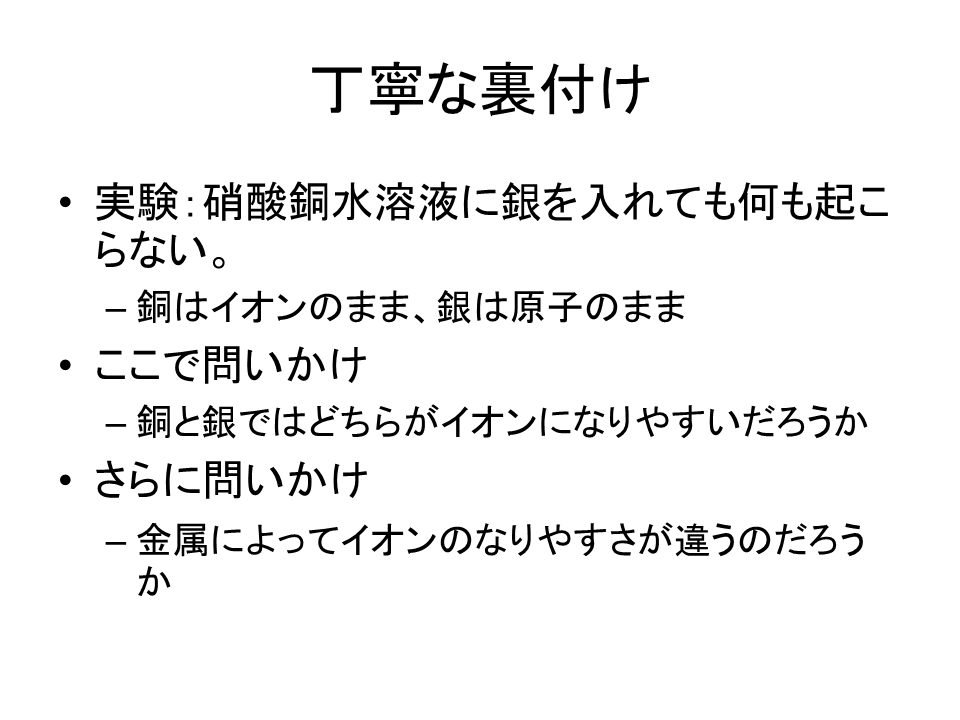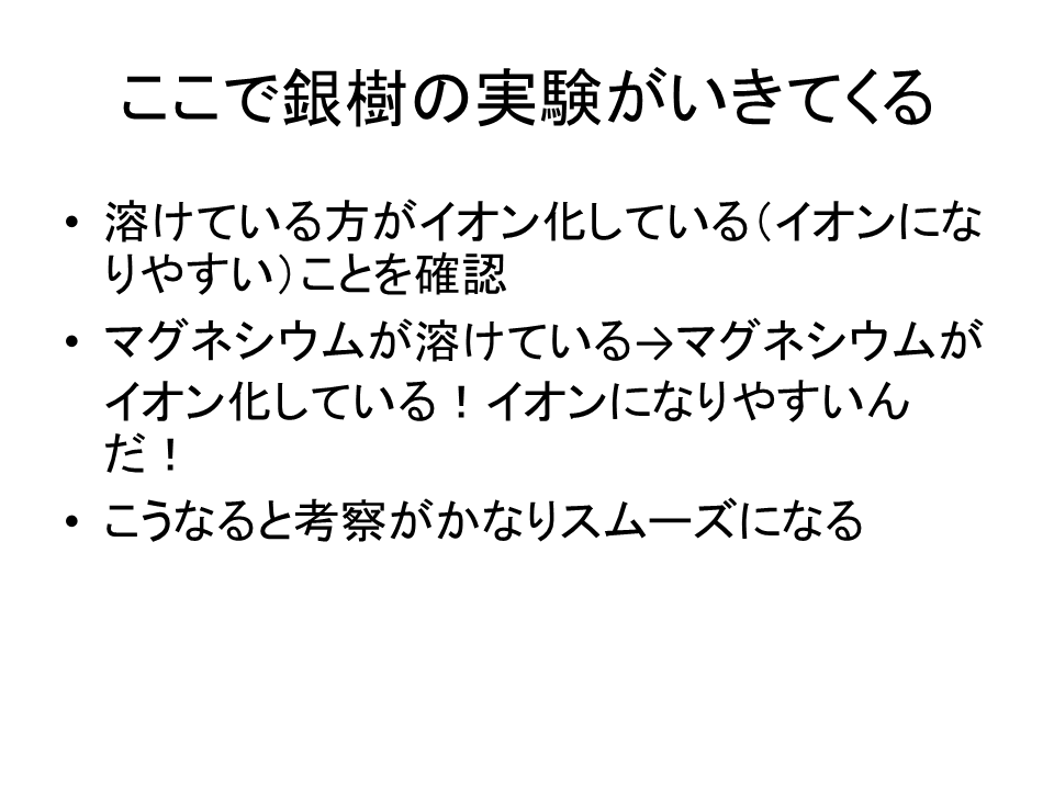 さらに、銅より亜鉛の方がイオンになりやすい、亜鉛よりマグネシウムがイオンになりやすい、と分かったところで、銅とマグネシウムを比較させようとすると、どうなるか予想がつきますよね。それができるようにさりげなく銅とマグネシウムを最後に回す細やかな仕掛けよ。