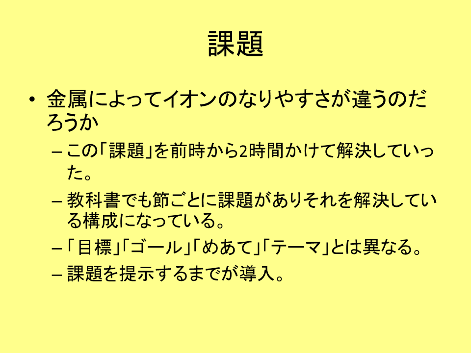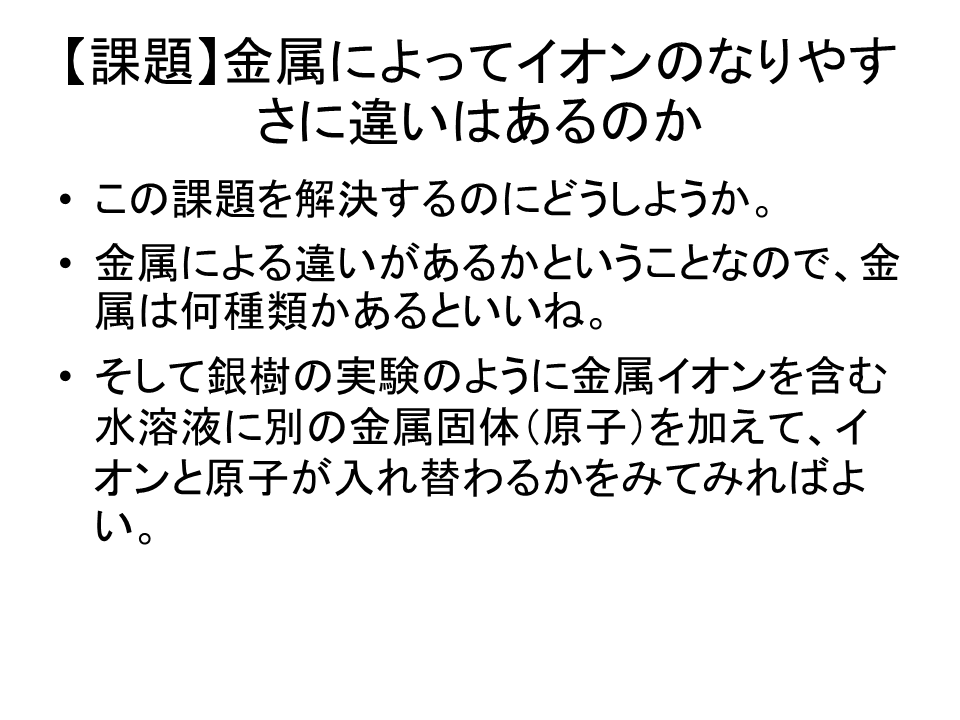が、ここで冒頭の銀樹の実験が意味をもってくるのです。結局今回の実験は2種類の金属を使った銀樹と同じ実験を3種類の金属を総当たり戦でやっていることにすぎません。つまり一つ一つの試合自体は、銀樹の時と全く同じなのです。だとすれば、課題解決への取り組みがわかりやすくなってきました。