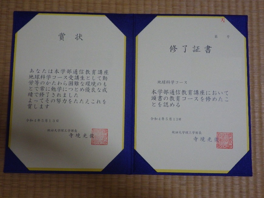 2019年の10月に秋田大の通信教育で地球科学の勉強を始めたのですが、2021年度中にとにかく全科目の単位を取得し、5月17日、修了証が届きました。