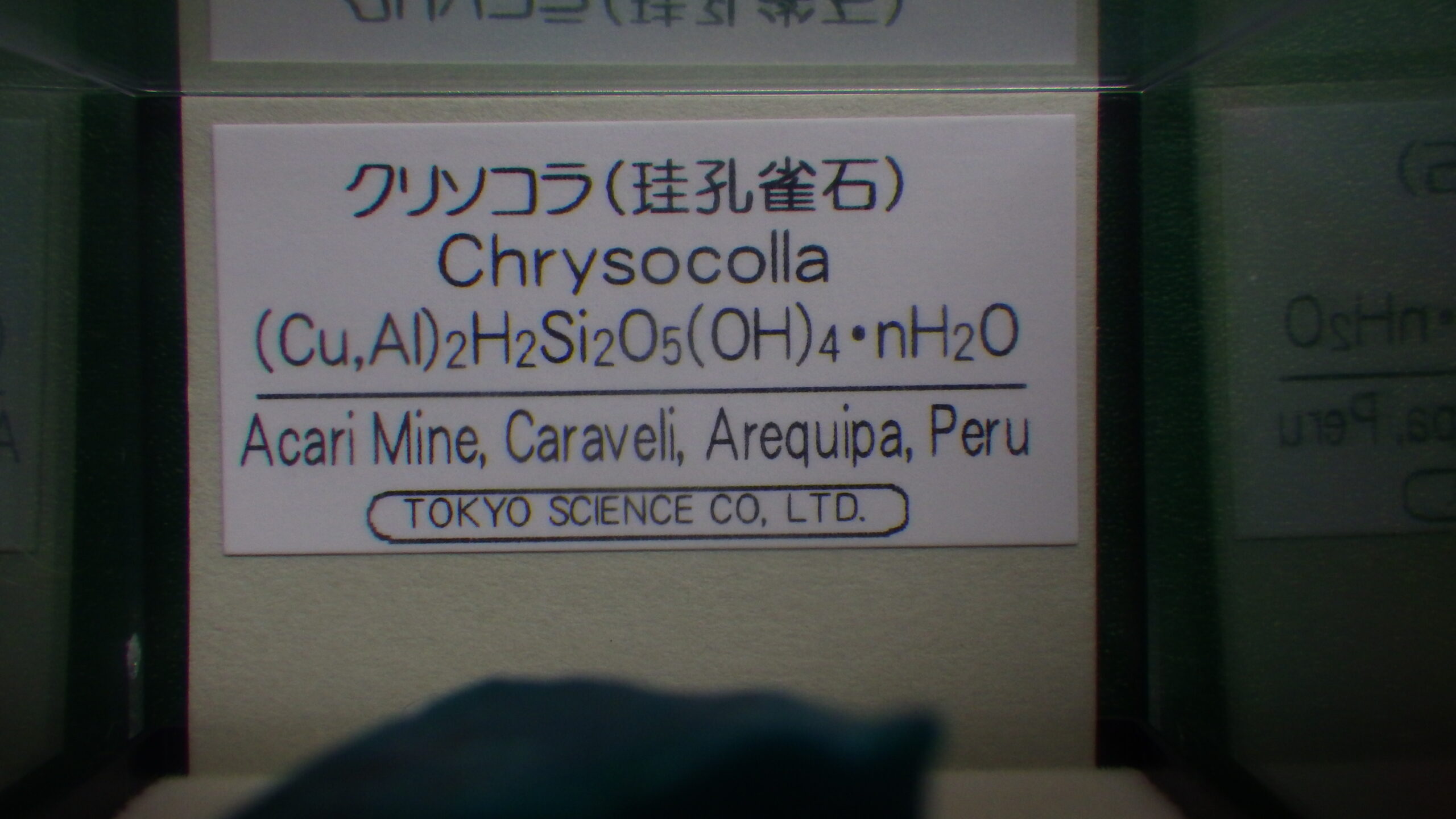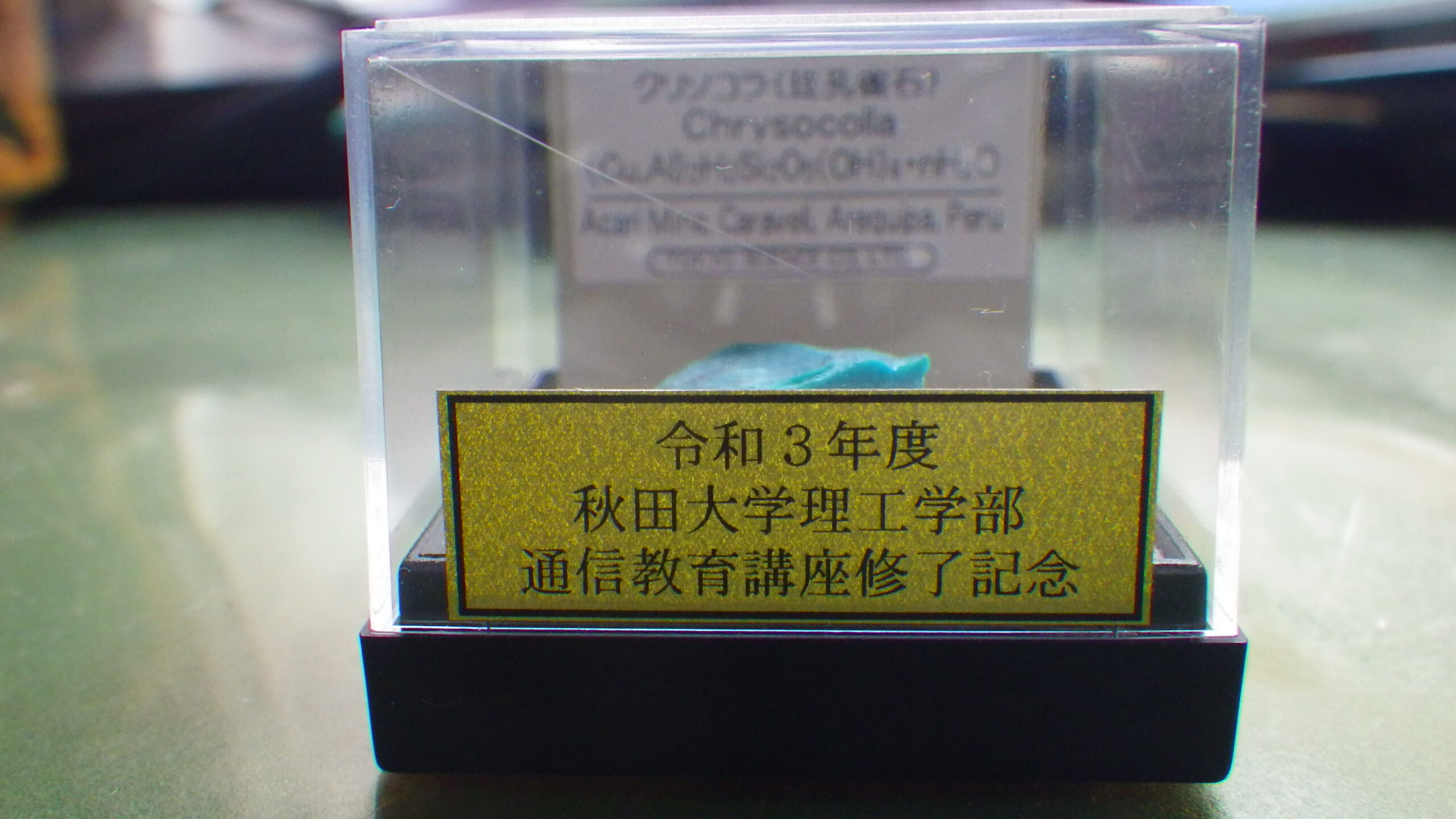 記念品としてクリソコラ。東京サイエンスのミニ鉱物標本ですね。