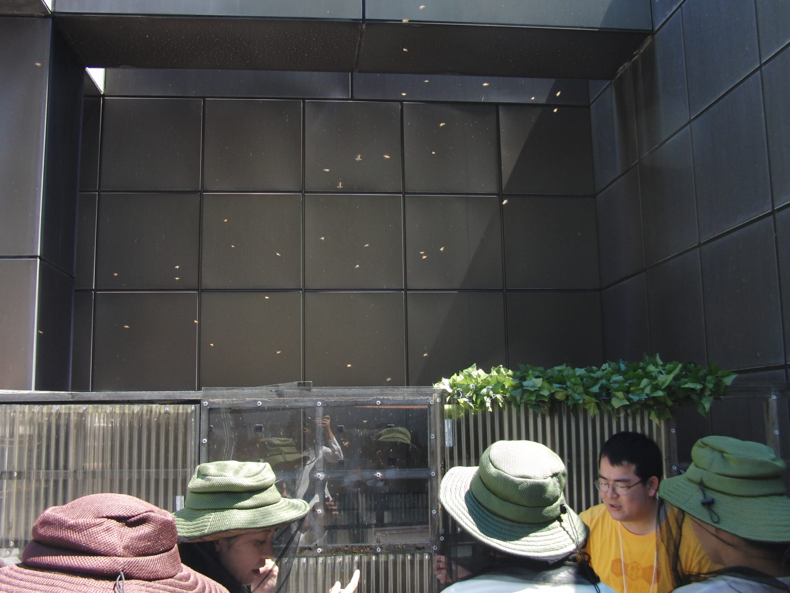 セイヨウミツバチのコーナー。この画像の上半分の黒バックに黄色い点々がありますが、これが飛んでる蜂です。ちなみに見学者は安全のため網付きの帽子をかぶっています。