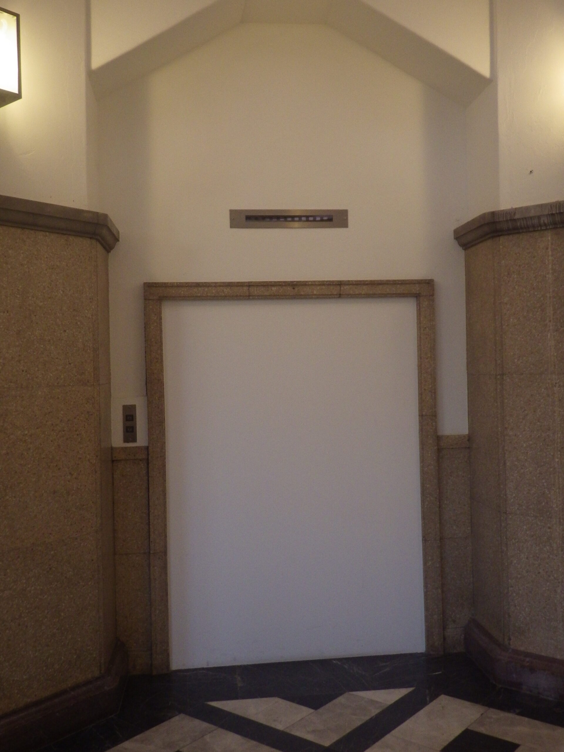 そのわきにあるのがエレベーター…とおもいきや、ドアのところが壁になっています。ボタンや階数表示もありますが、点灯していません。