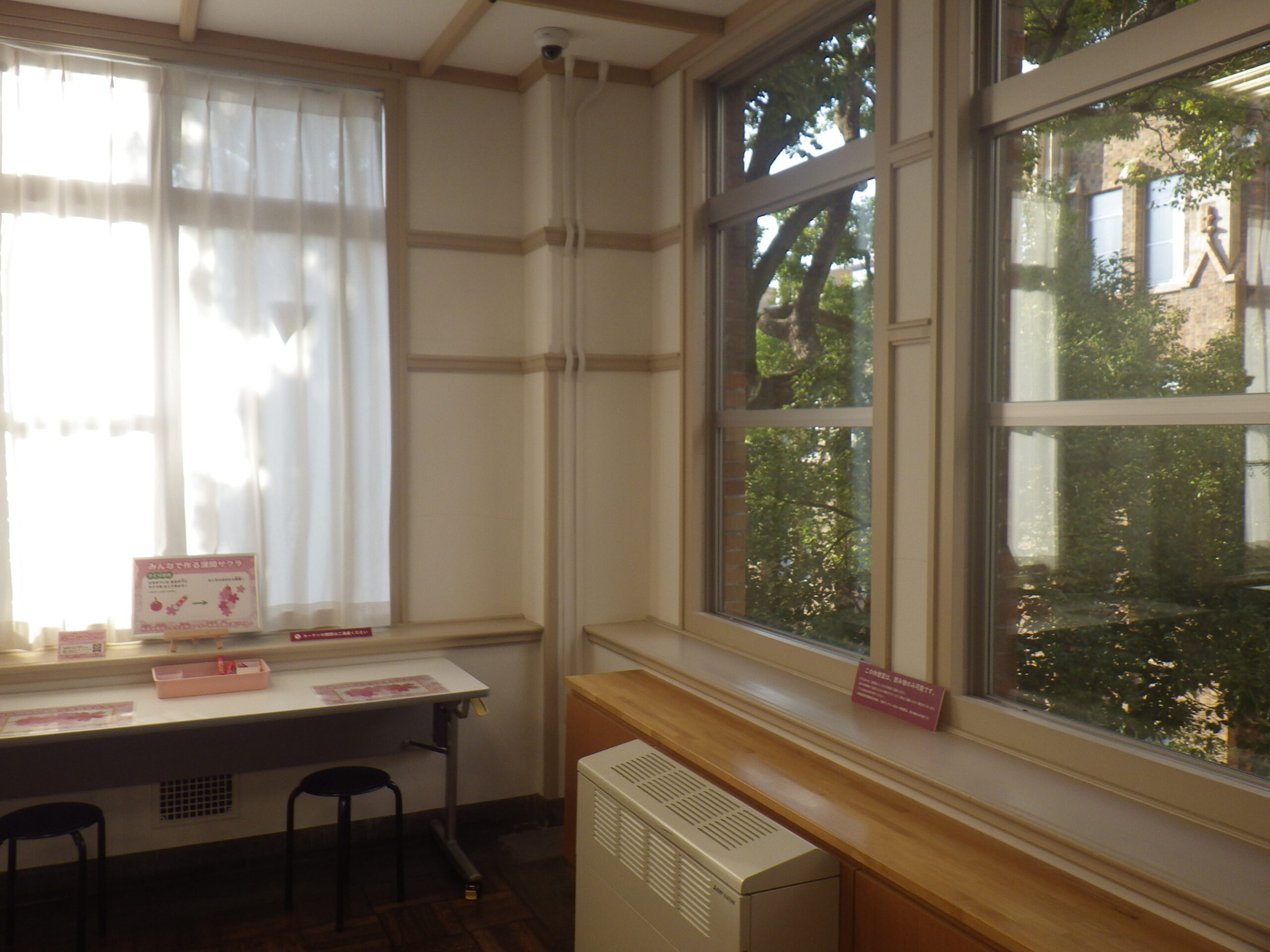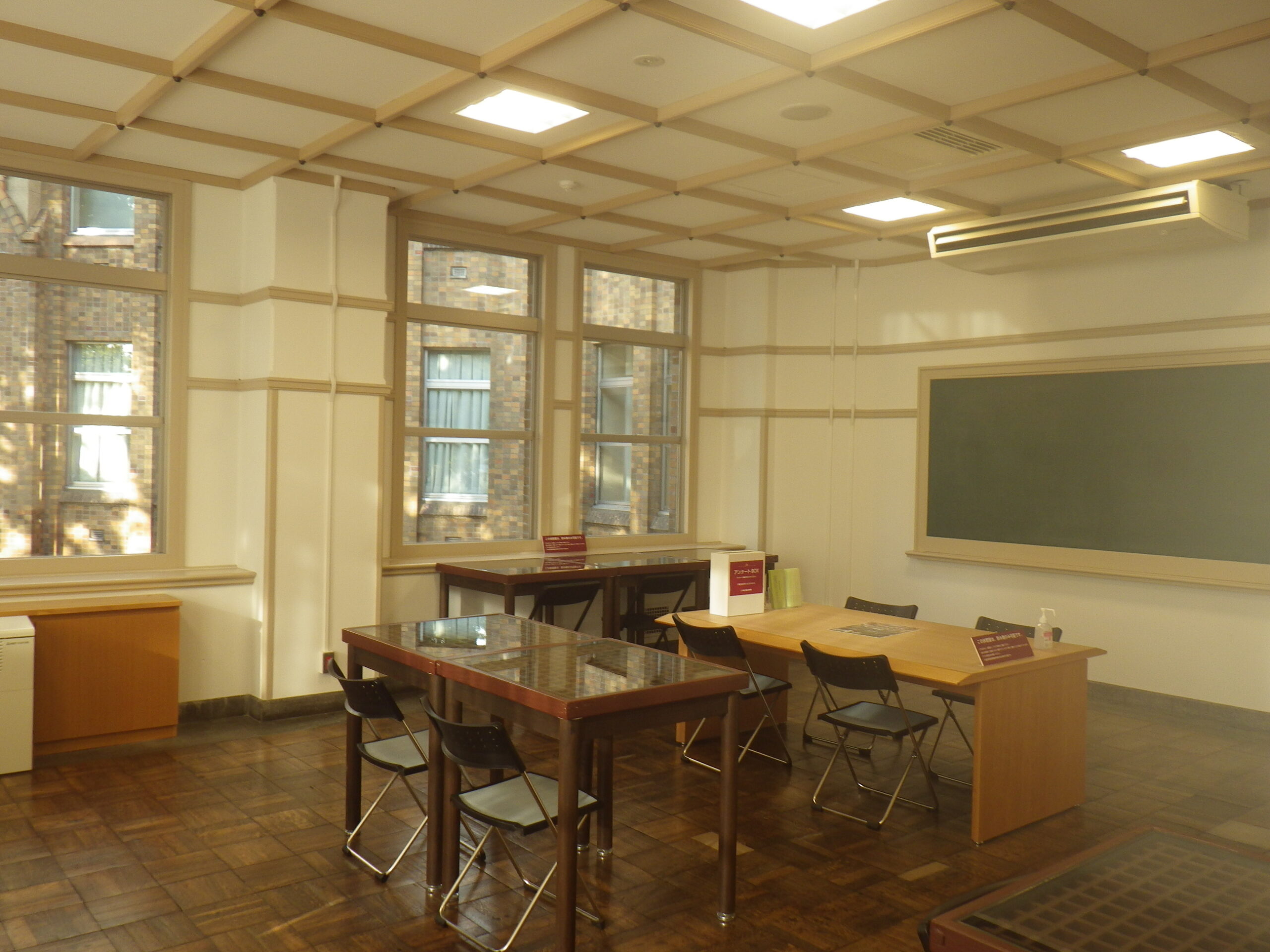 例えば4階のこの部屋は現在は休憩室として使われていますが、当時の様子をなるべく残そうとしています。旧講義室だったらしく、黒板なんかも残っています。