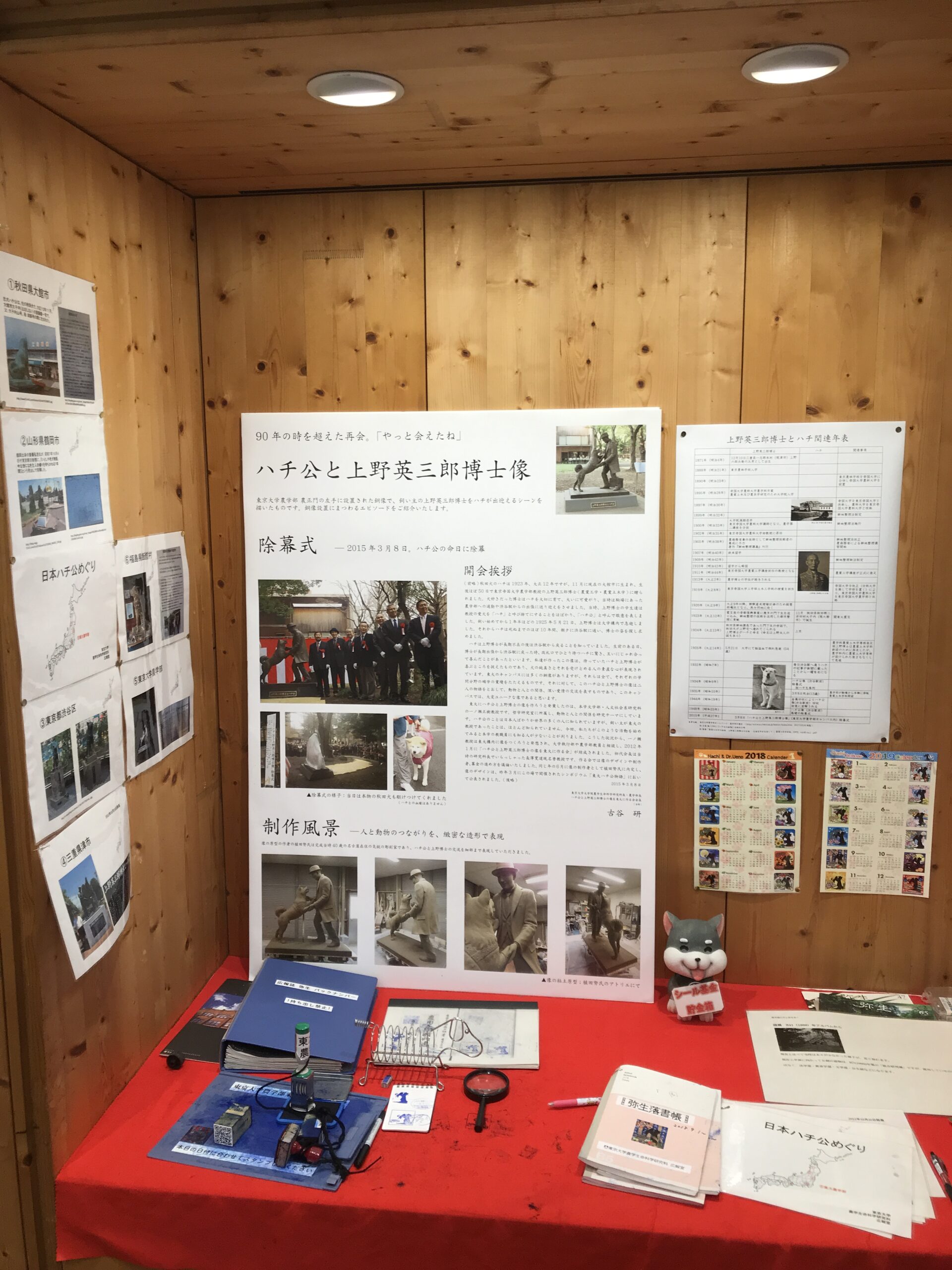 秋田犬のハチは大館市に生まれ、生後50日ほどで東京帝国大学農学部の上野英三郎博士(農業工学・農業土木学)に 贈られた。犬好きだった博士は鉢を大切に育て、大いに可愛がり、当時は駒場にあった農学部への出勤や渋谷駅からの出張にはいつも送り迎えをさせた。学生たちは教授の飼い犬を呼び捨てにすることをはばかり、「ハチ公」と呼んで敬意を表した。およそ1年半が過ぎた1925年5月21日、博士は大学構内で急死した。それからハチは死ぬまでのおよそ10年間、朝タに渋谷駅に通い、博士の姿を探し求めた。 生前、博士が長期出張から渋谷駅に戻った時、改札口で ひとり待つハチに驚き、この像のように、互いにじゃれ合って喜んだという。 制作:植田努 2015年