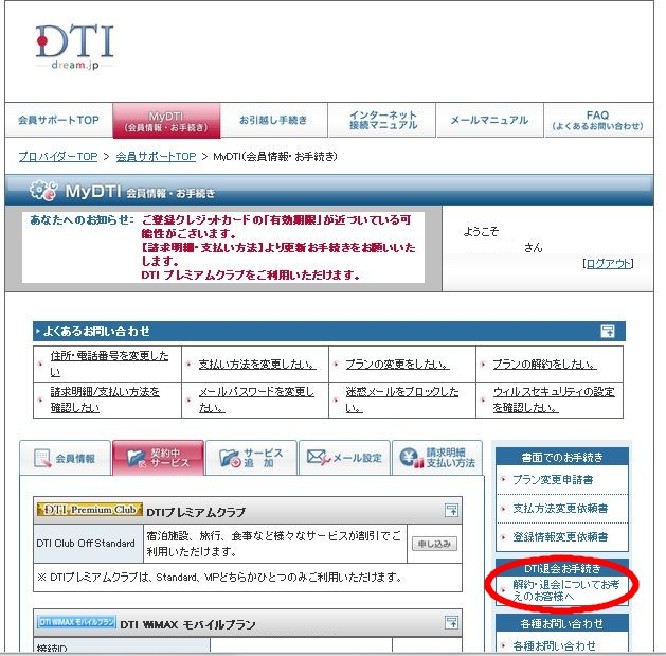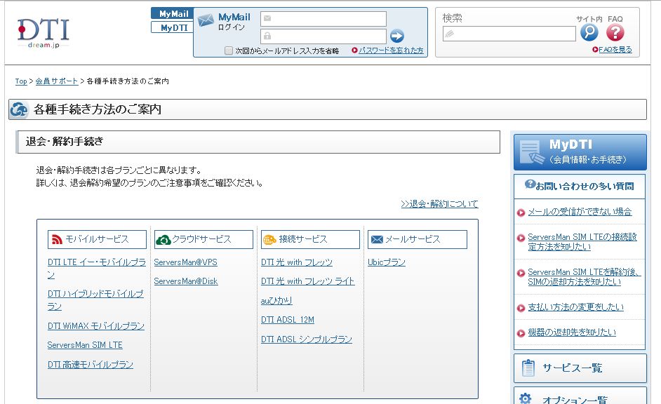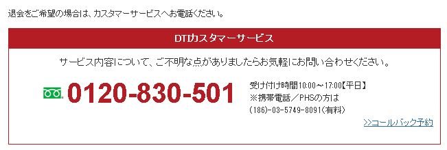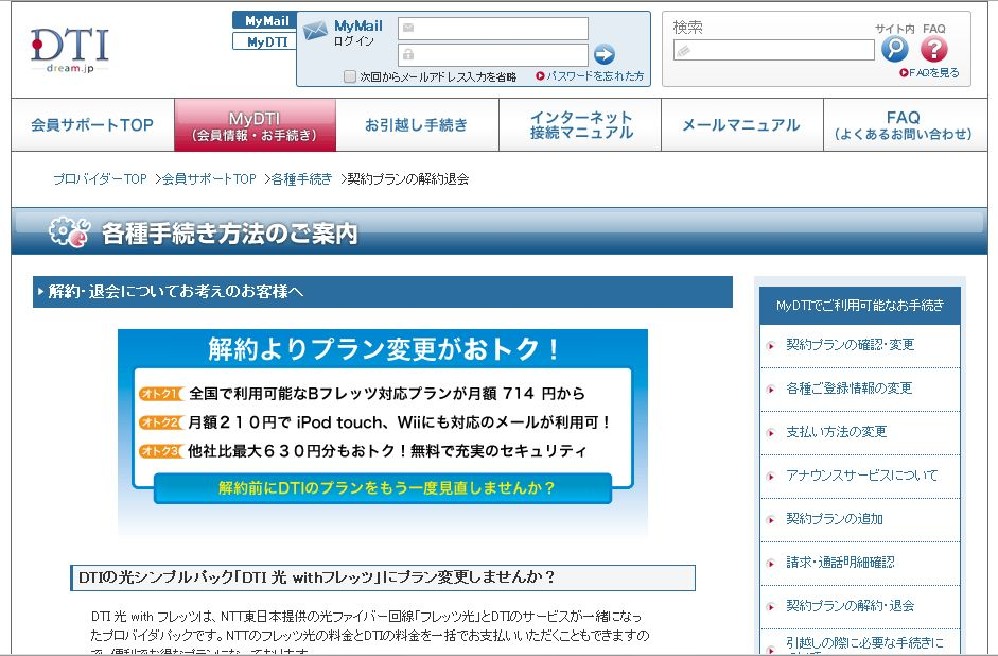 右側の「DTI解約お手続き 解約・退会についてお考えのお客様へ」をクリックすると、またこのページに戻ります。そこで、一番下にある「解約・退会についてお考えのお客様へ」をクリックするのが正解。