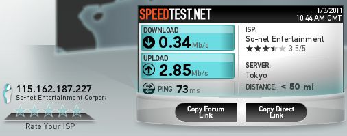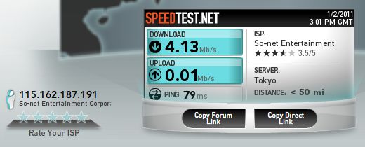Speedtest.netでBeginTestをクリックしてもしばらく動かない。1分ぐらいしてダウンロードで0.01~0.04あたりをうごいて、急に思い出したように針が振れだし4.13まで振れて、こうなりました。