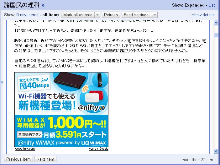 このエントリーをgoogleリーダーで見たら、WiMAXの広告がついていた…(汗
