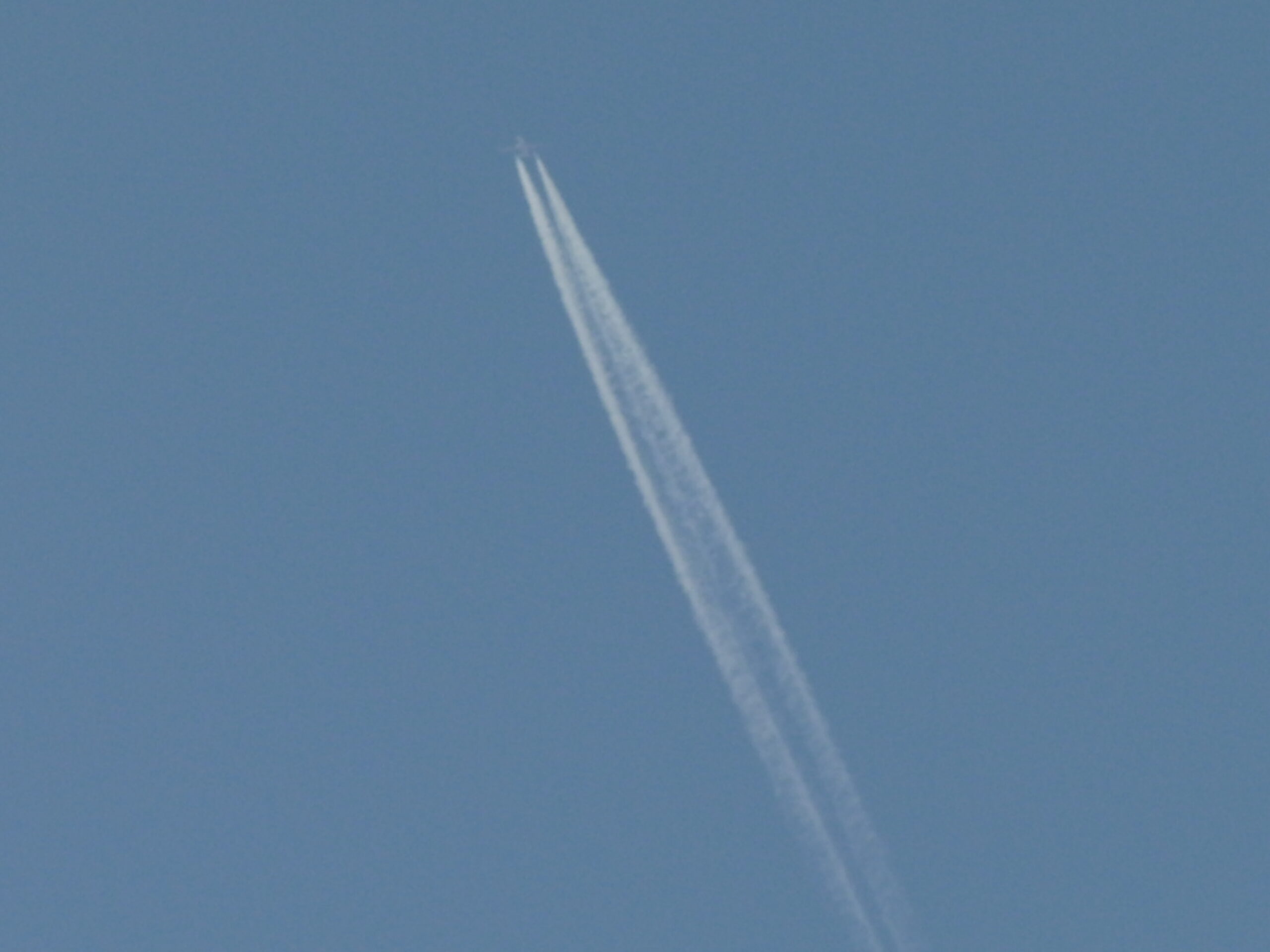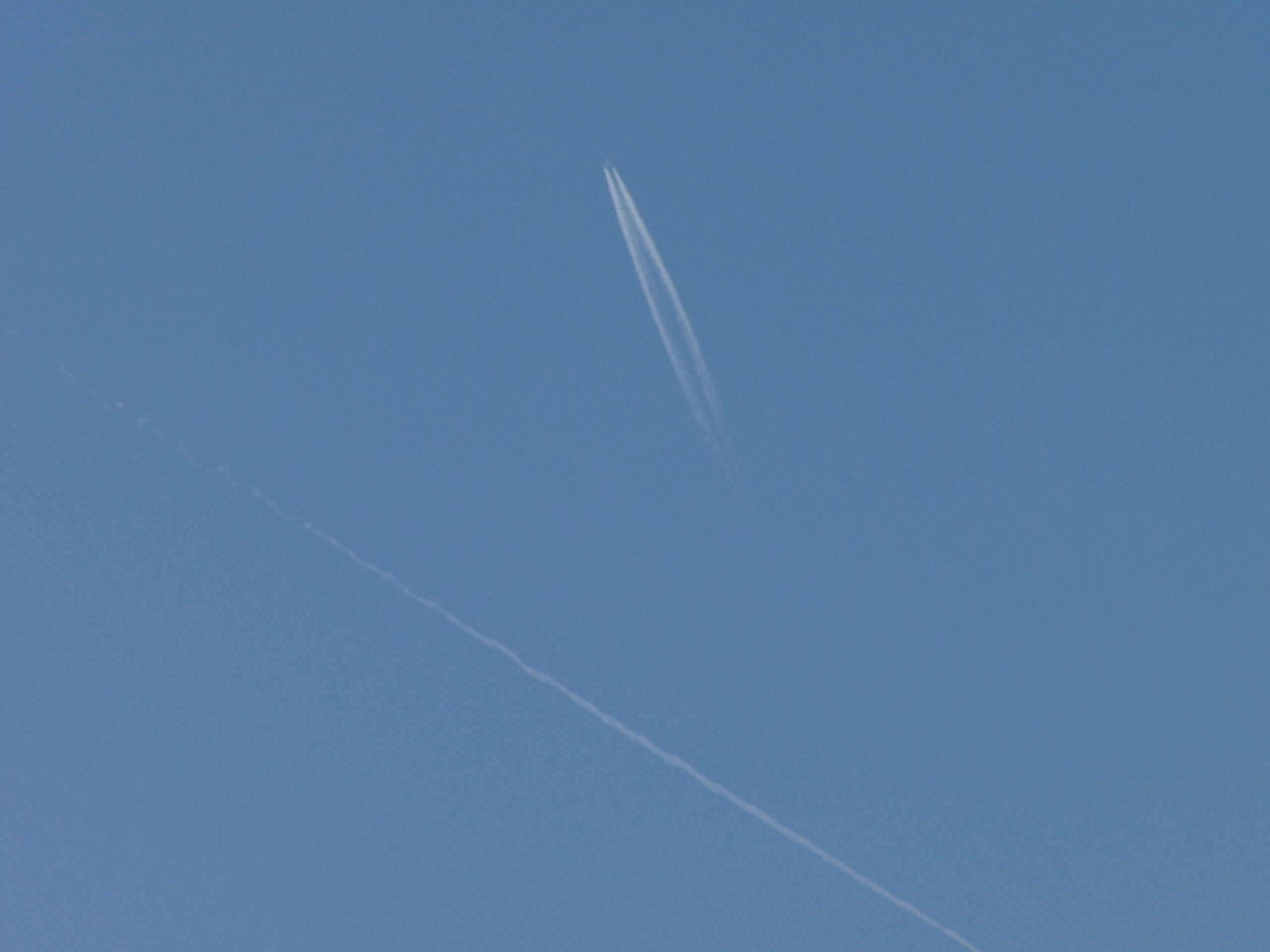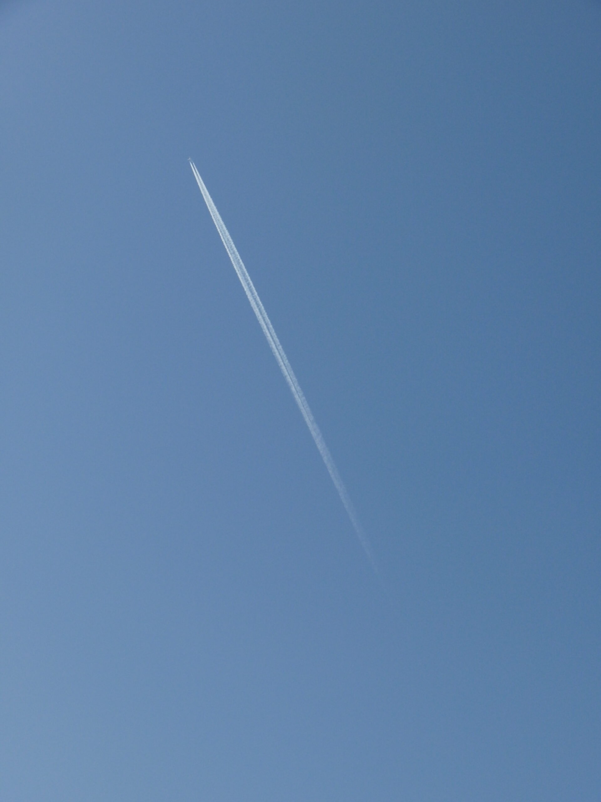 離陸していく方の飛行機雲です。肉眼ではわかりませんでしたが、写真では機体もわかります。