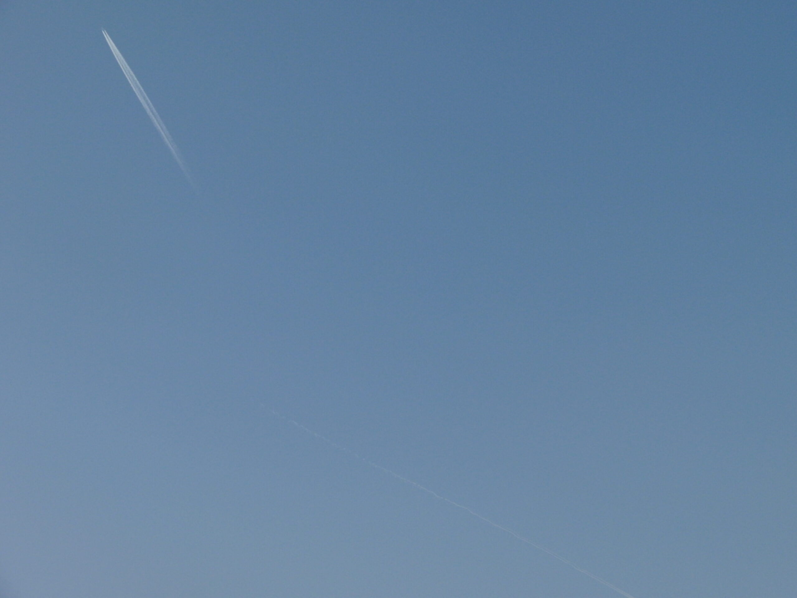 離陸と着陸する2機の飛行機がそれぞれ飛行機雲を作っていました。