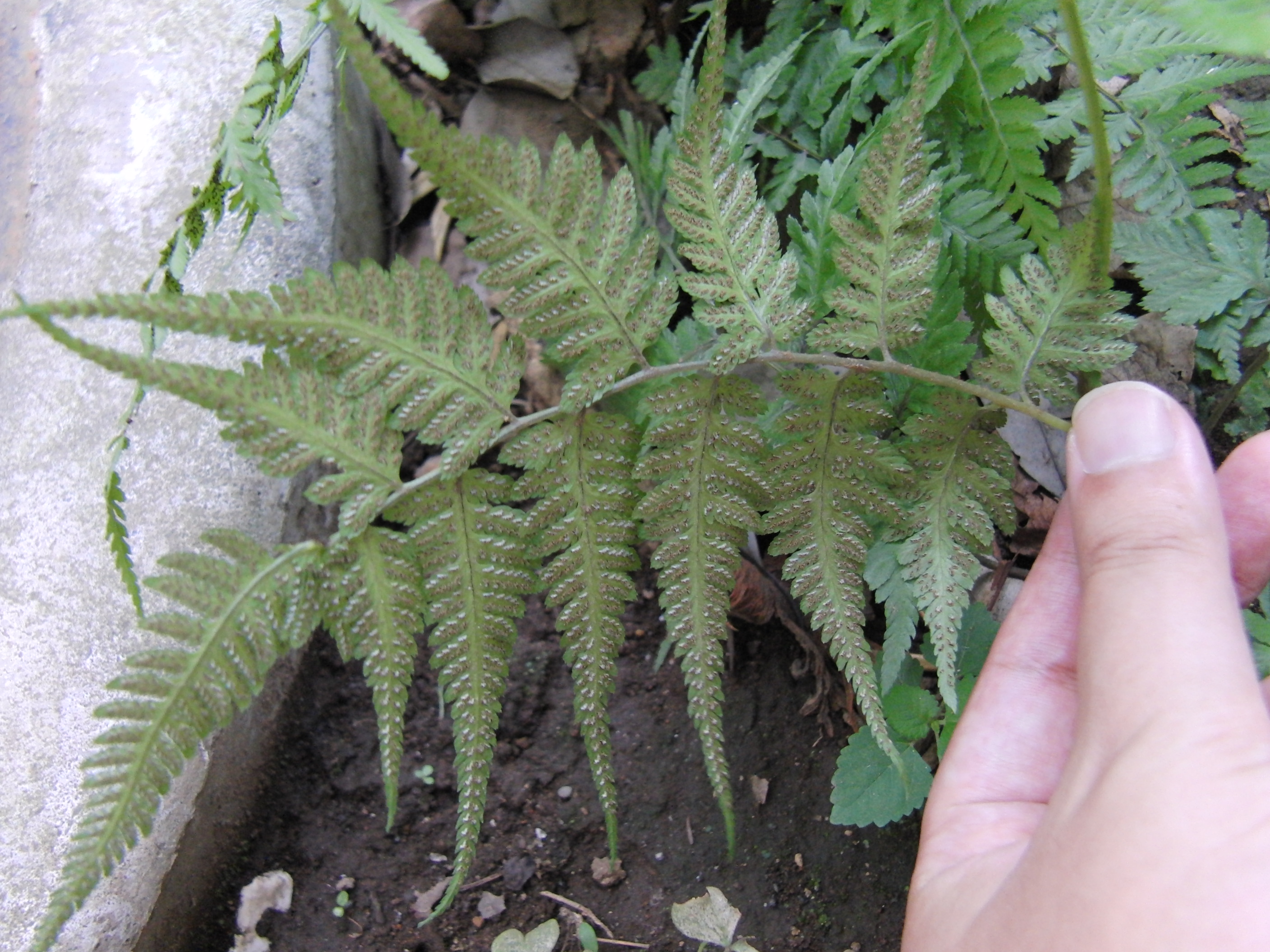 梅雨の時期に葉を見てみましょう。表は普通の緑ですが…裏は茶色というか黒っぽいものがついていることがあります。これがソーラス(英sorus: 複数個の胞子のう(胞子嚢)が集合した構造体)です。うらにソーラスがついている葉を胞子葉といいます。